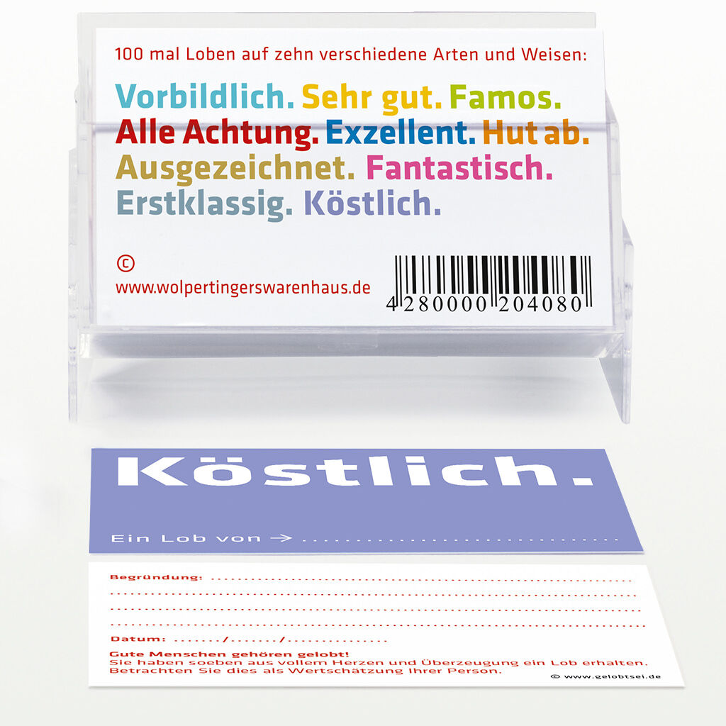 Lobkärtchen für den Alltag wird Wertschätzung und Motivation in nachhaltiger Form garantiert. Die handlichen Kärtchen tun gute Dienste im privaten Umfeld, der Öffentlichkeit aber auch in Unternehmen. Die Lobkärtchen können spontan, immer aber systematisch über...