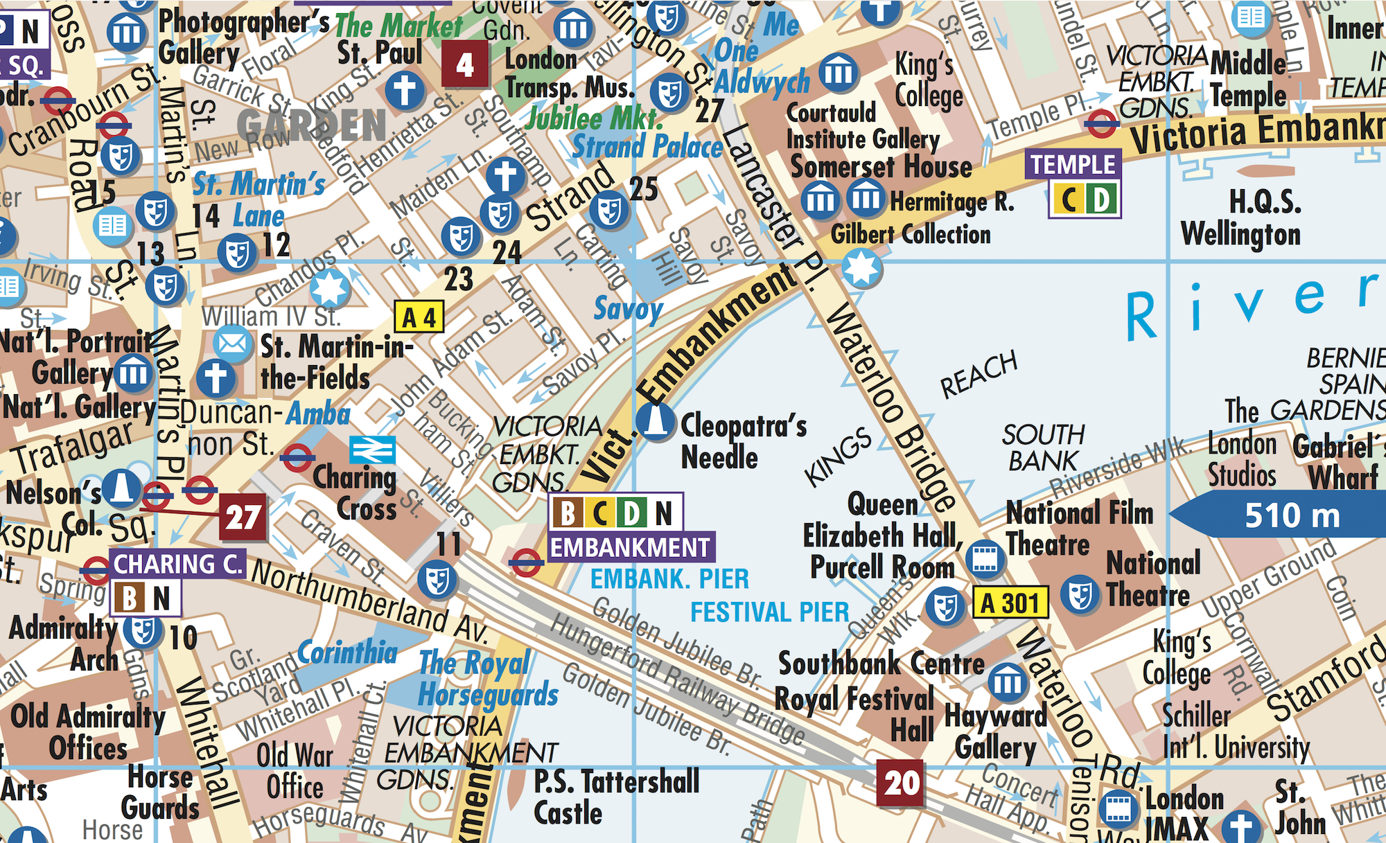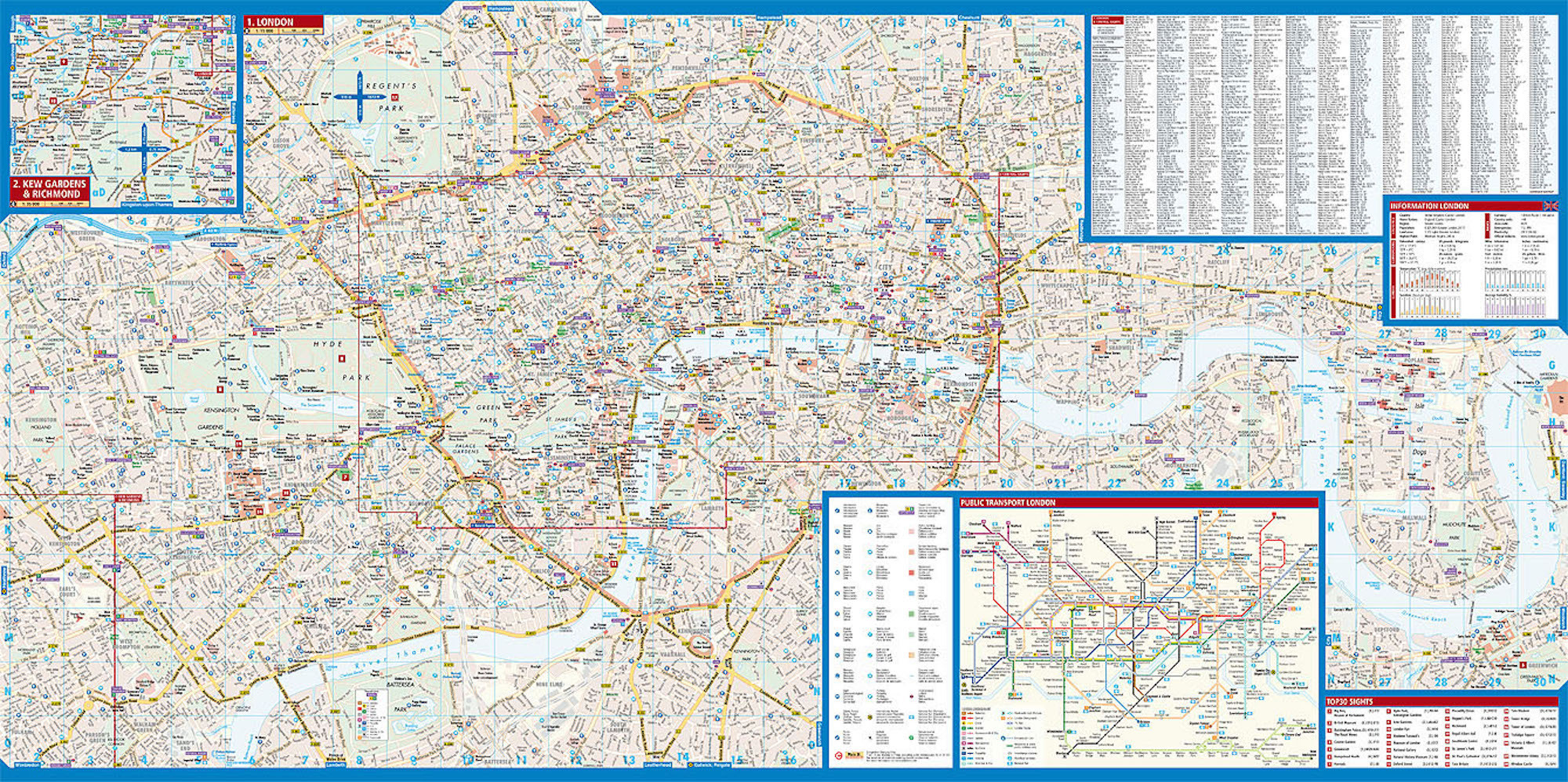 Our laminated and folded Borch Map of London in the 22nd edition contains: London 1:15 000, Kew Gardens & Richmond 1:35 000, Central Sights 1:11 000, Greater London 1:375 000, Airports Heathrow, Gatwick, Stansted, the public transport system and an adminis...