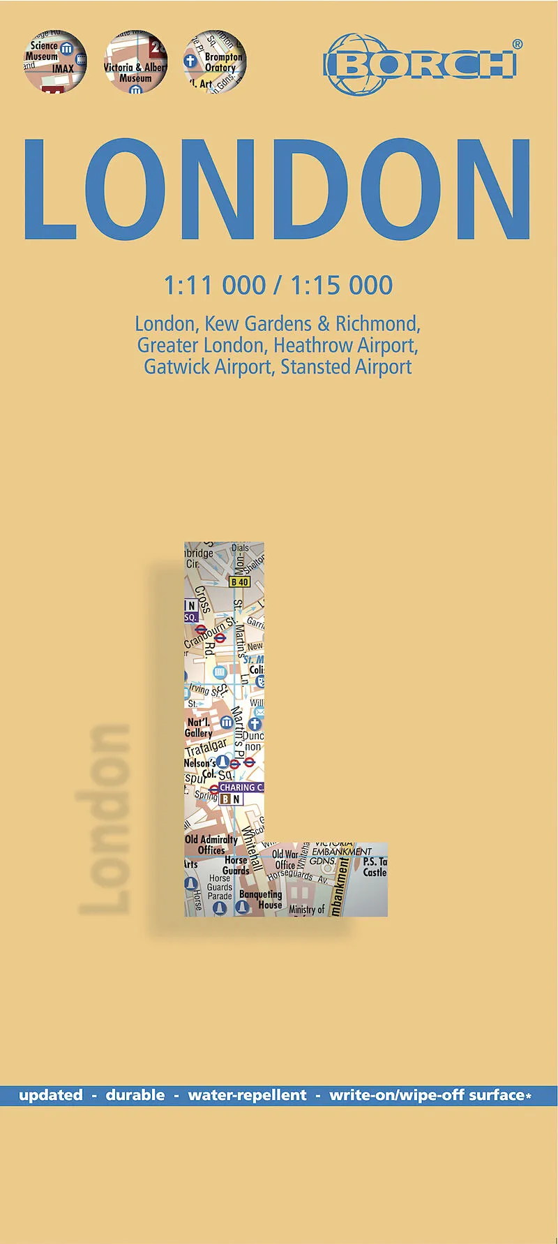Our laminated and folded Borch Map of London in the 22nd edition contains: London 1:15 000, Kew Gardens & Richmond 1:35 000, Central Sights 1:11 000, Greater London 1:375 000, Airports Heathrow, Gatwick, Stansted, the public transport system and an adminis...