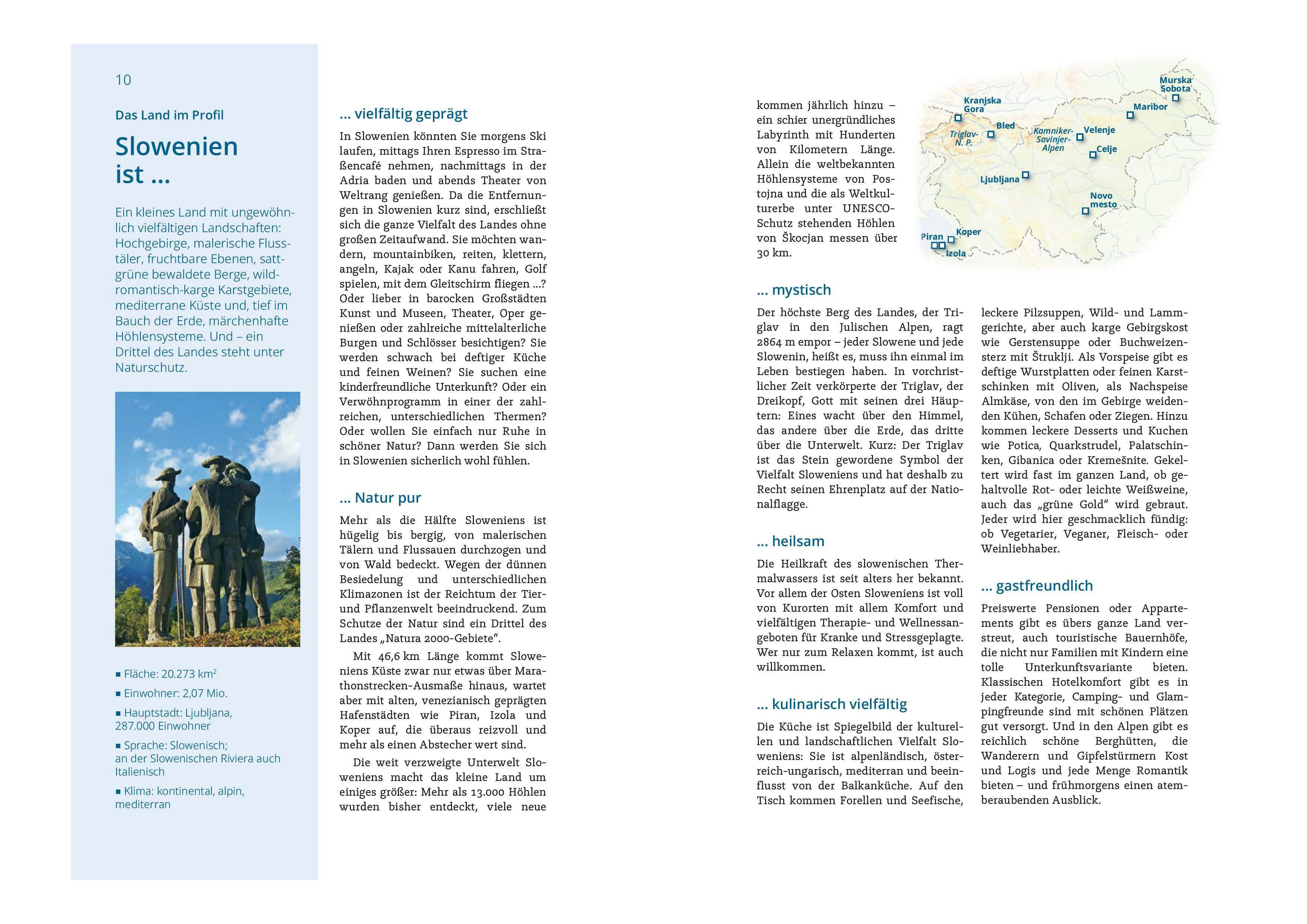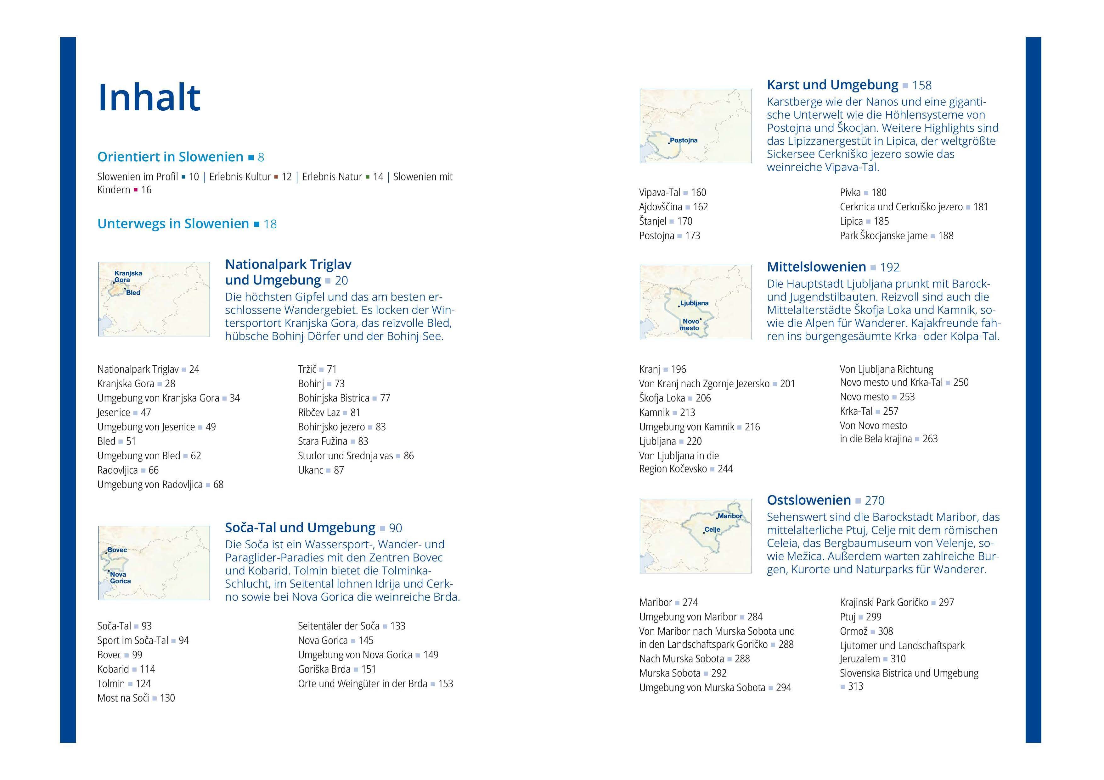 Ljubljana, Maribor, Ptuj und das Krka-Tal werden ebenso präzise vorgestellt wie der Bleder See oder die Höhlen von Postojna. Von den Julischen Alpen über das Soca-Tal bis zur slowenischen Riviera mit Piran und Portoro: Sie planen Ihre Reise mit detaillierten Infos zu Sehenswürdigkeiten Slowenien, Hotels Slowenien, Wanderwegen und regionaler Küche.