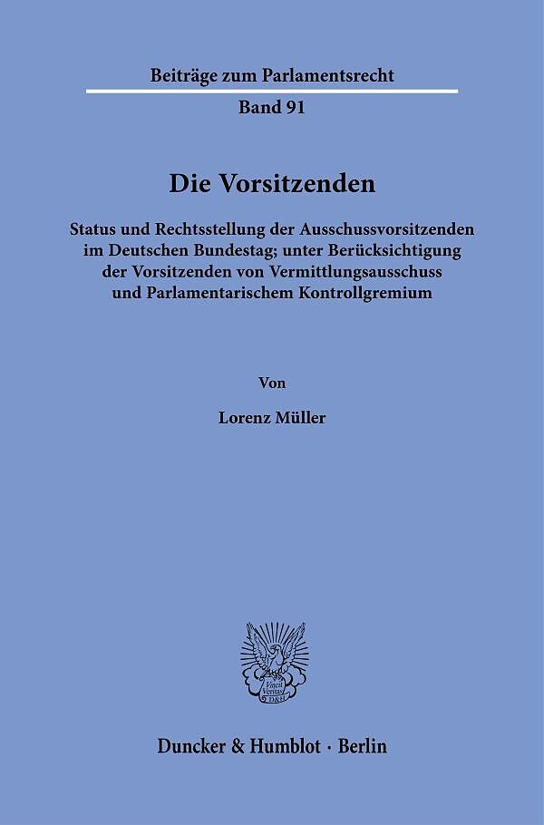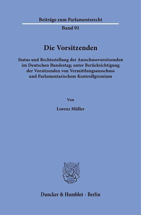 Die Arbeit untersucht die (verfassungs-)rechtlichen Vorgaben in Bezug auf den Amtsbeginn, das Amtsende sowie die Rechte- und Pflichtenstellung der Ausschussvorsitzenden. Nicht nur der intraparlamentarische Wirkbereich, sondern auch das extraparlamentarische St...
