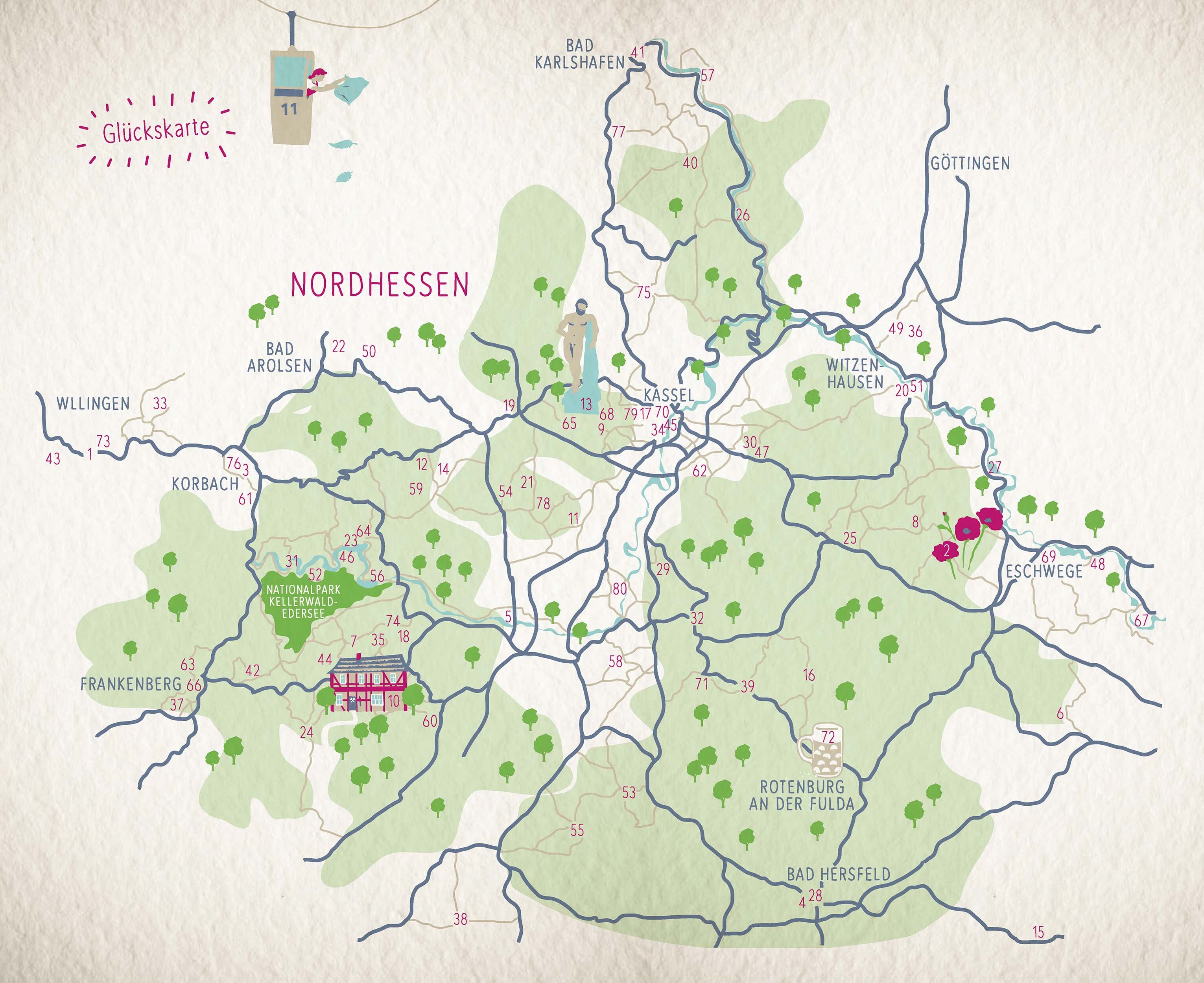Willkommen in der Grimmheimat Nordhessen! Hier finden sich Glücksorte zuhauf: In verwunschenen Wäldern trifft man auf Schneewittchen und die sieben Zwerge, kann Häuser besichtigen, die auf dem Kopf stehen und Baumriesen entweder von unten bestaunen oder in ihr...