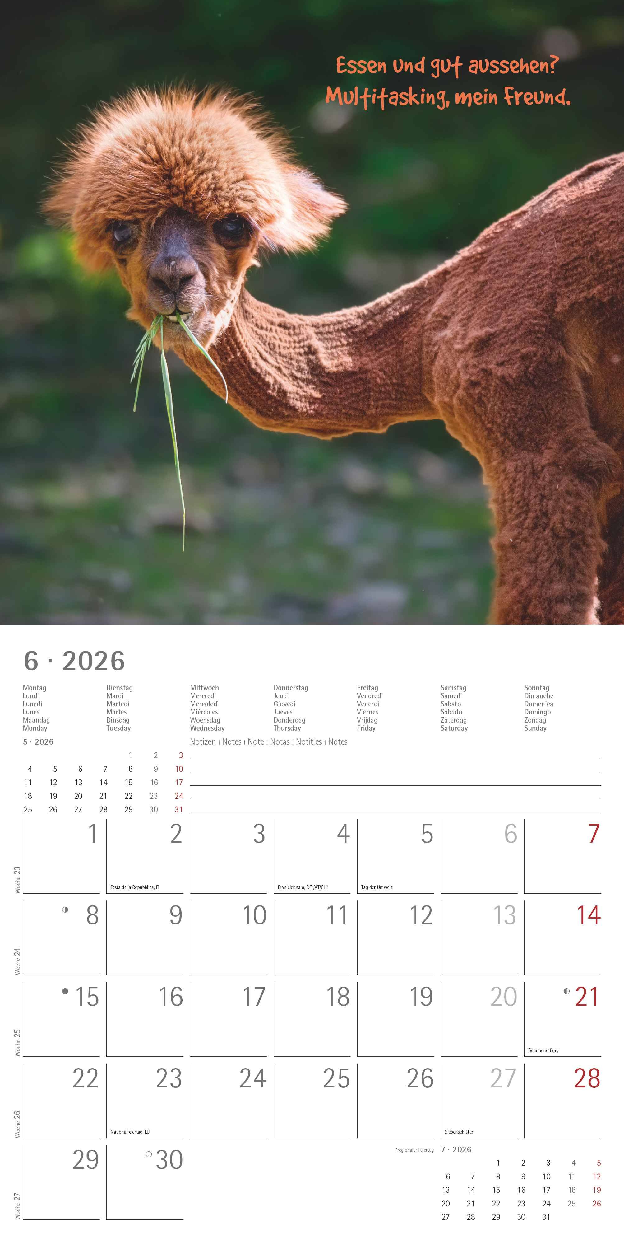 Alpha Edition - Funny Animals 2026 Wandkalender 30×30 cm (30×60 geöffnet) mit lustigen Tierfotos & Sprüchen, 6-sprachiger Broschürenkalender mit Platz für Notizen und internationalen Feiertagen