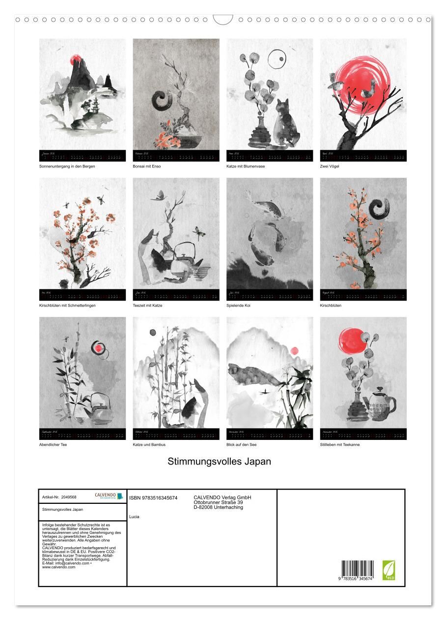 Ob Landschaft, Stillleben oder Tiere, die ausdrucksstarke Technik japanischer Tuschmalerei vermittelt uns Ruhe und Gelassenheit, eine meditative Stimmung, die uns über das Jahr begleitet.