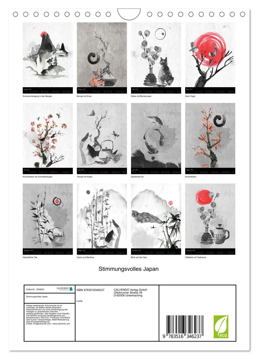 Ob Landschaft, Stillleben oder Tiere, die ausdrucksstarke Technik japanischer Tuschmalerei vermittelt uns Ruhe und Gelassenheit, eine meditative Stimmung, die uns über das Jahr begleitet.