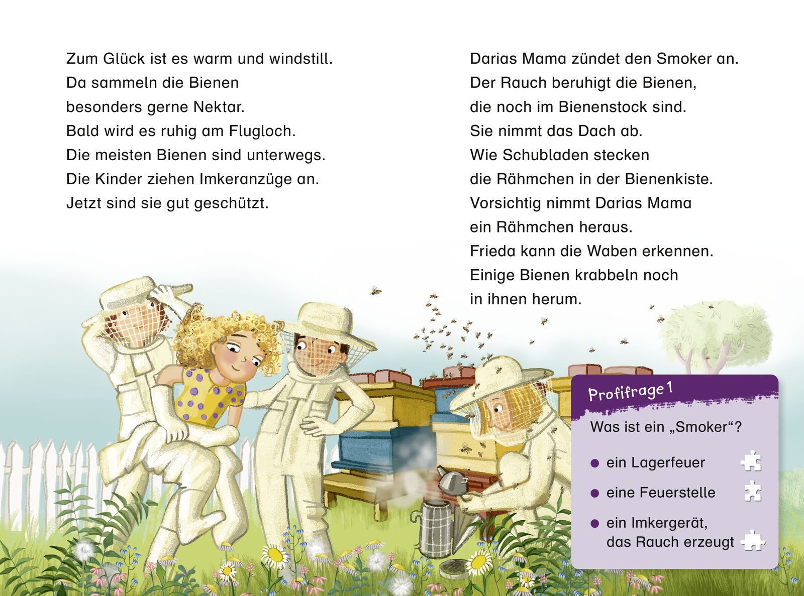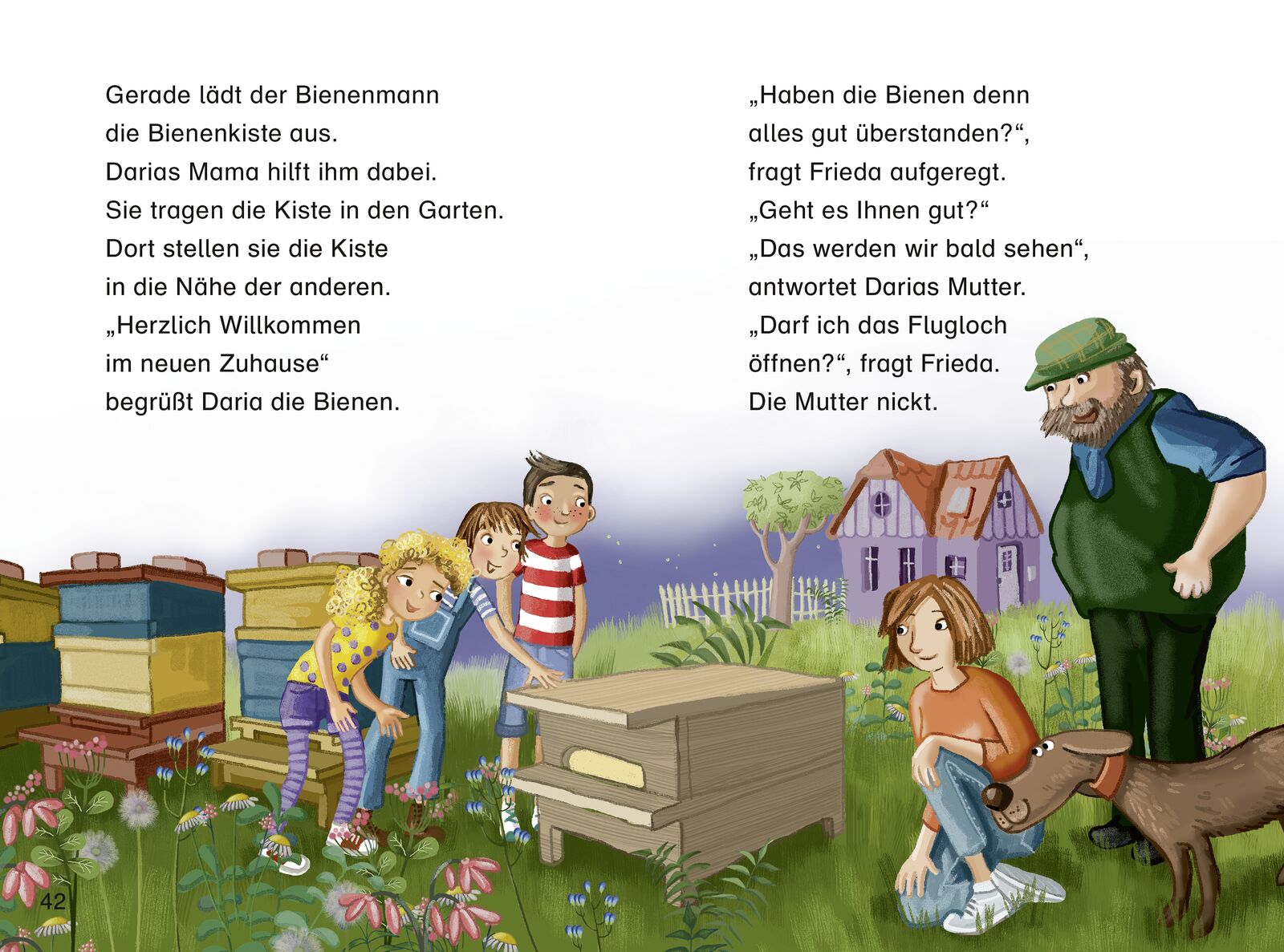 Abenteuergeschichte für kleine und große Bienenfreunde ab 7 Jahren Frieda ist aufgeregt! Heute ist Bienentag bei Daria. Gemeinsam mit Mario, darf Frieda zuschauen, wie Darias Mama die Bienenstöcke im Garten kontrolliert. Den Bienenvölkern und der Bienenkönigi...