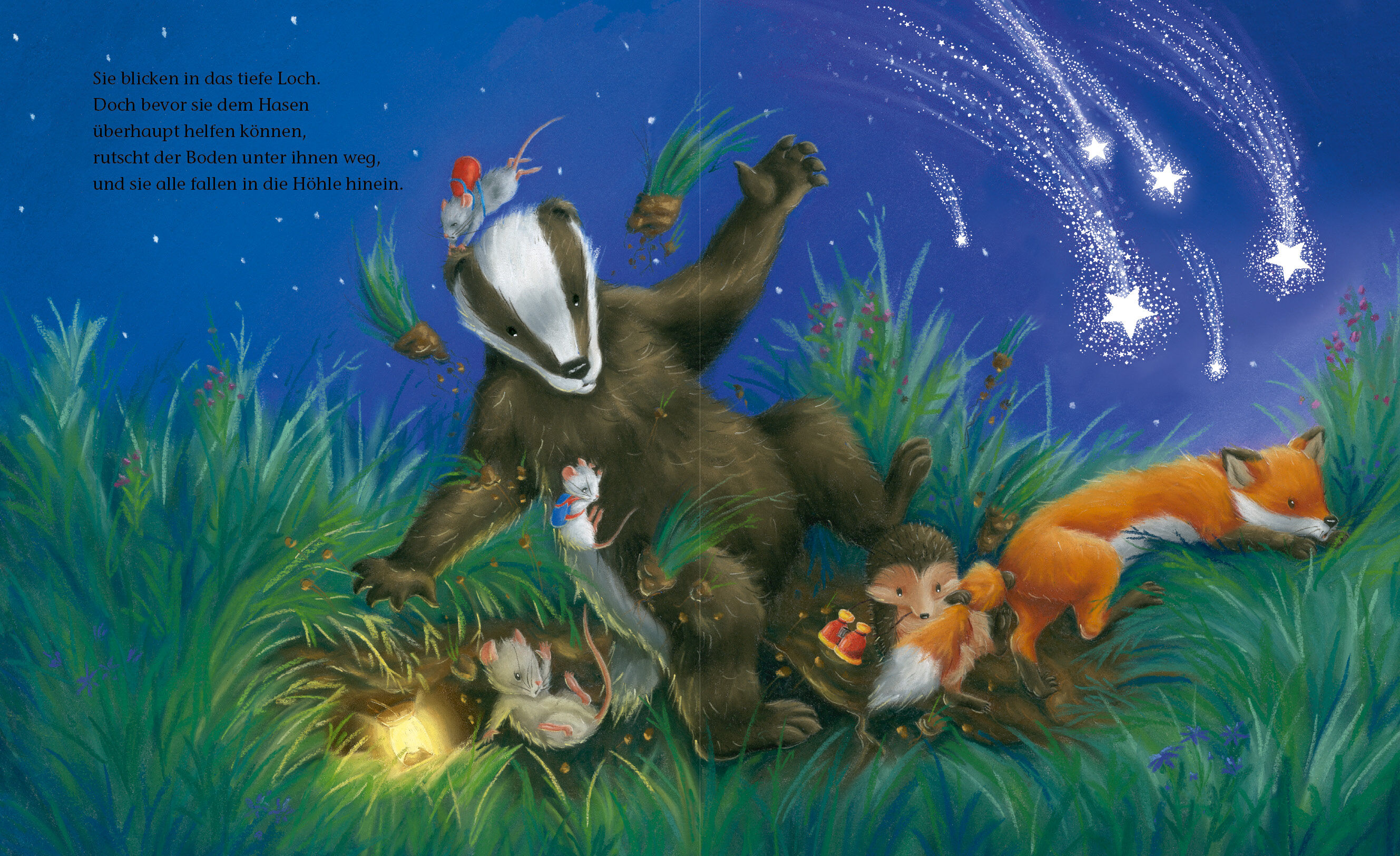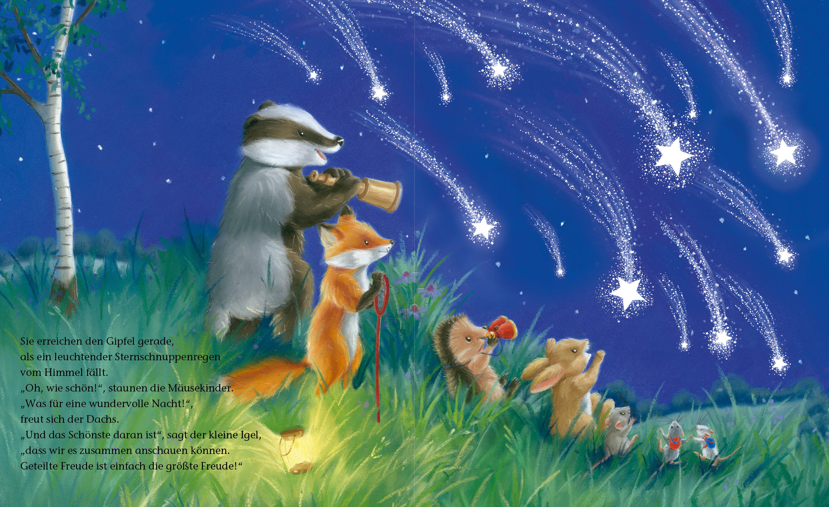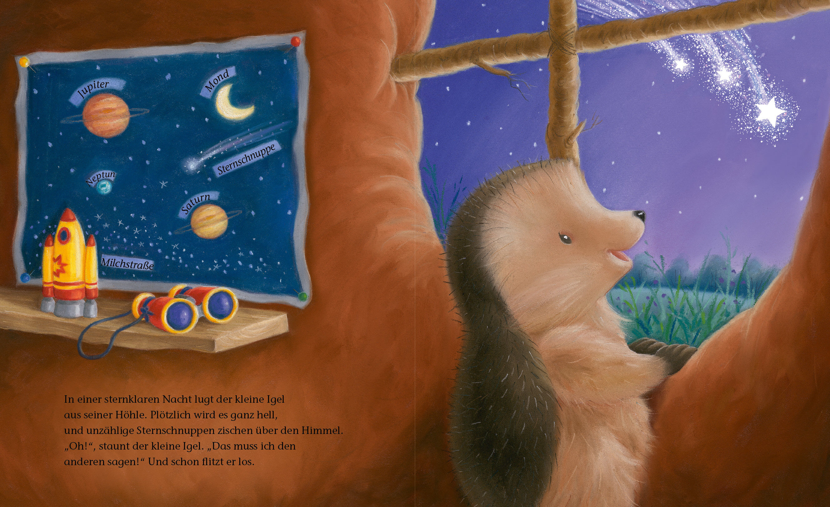 Staunend blickt der kleine Igel in den Nachthimmel. Unzählige Sternschnuppen fallen funkelnd herab. Mit seinen Freunden sucht er den schönsten Aussichtspunkt für das großartige Naturschauspiel. Doch dann ist plötzlich der kleine Hase verschwunden. Wo mag er nu...