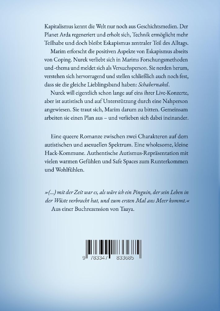 Kapitalismus kennt die Welt nur noch aus Geschichtsmedien. Der Planet Arda regeneriert und erholt sich, Technik ermöglicht mehr Teilhabe und doch bleibt Eskapismus zentraler Teil des Alltags. Marim erforscht die positiven Aspekte von Eskapismus abseits von Cop...