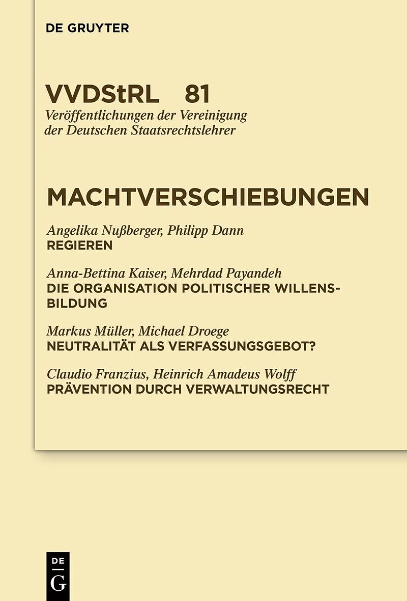 Dieser Band enthält die Referate und Diskussionen der Tagung der Vereinigung der Deutschen Staatsrechtslehrer in Mannheim vom 6. bis 9. Oktober 2021: MACHTVERSCHIEBUNGEN Angelika Nußberger, Philipp Dann; Regieren Anna-Bettina Kaiser, Mehrdad Payandeh; Die Org...
