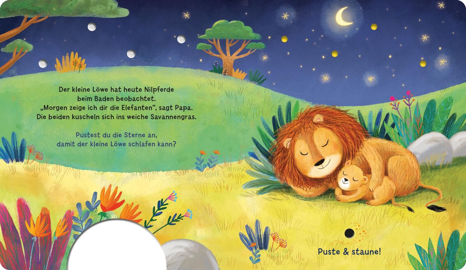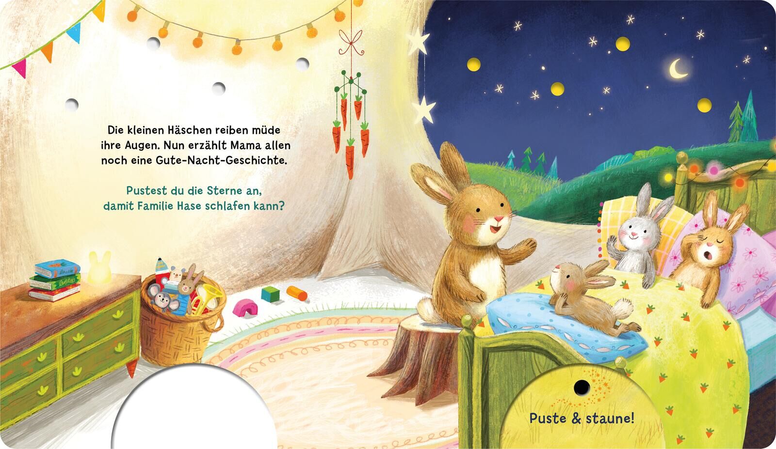 Einmal pusten und es leuchtet! Mitmach-Buch für die Allerkleinsten! Dieses Pappebuch für Kinder ab 18 Monaten begeistert durch seinen magischen Mitmach-Effekt : Einmal pusten und die Lichter beginnen zu leuchten. Bei Familie Hase sind alle hundemüde, das Kätz...