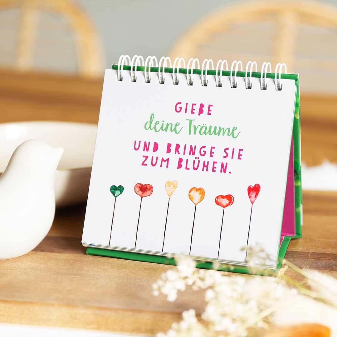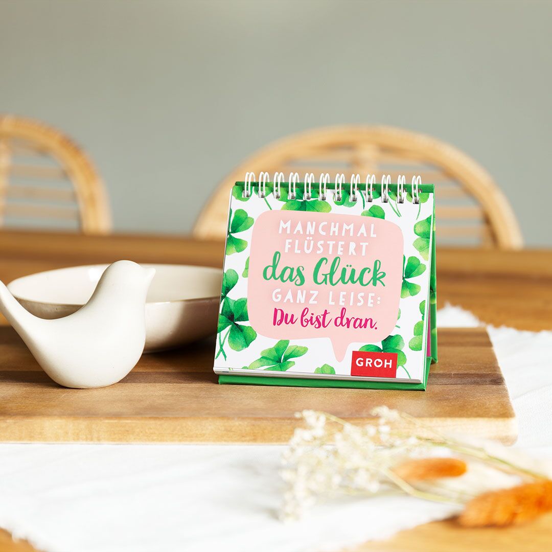 Fröhlicher Aufsteller mit Glücks-Sprüchen für Lieblingsmenschen Der kleine Aufsteller rund ums Thema Glück verzaubert mit einer neuen Interpretation der beliebten Kleeblatt-Optik und schenkt deinem Lieblingsmenschen eine ordentliche Portion gute Laune, neue K...