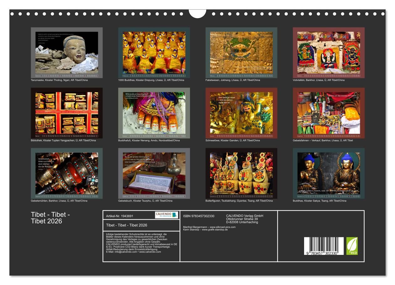 Dieser Kalender zeigt Fotos aus allen Teilen des historischen Tibets (Kham, Amdo, Ü, Tsang, Ngari) in Verbindung mit einem zu dem Bild passenden Sinnspruch.