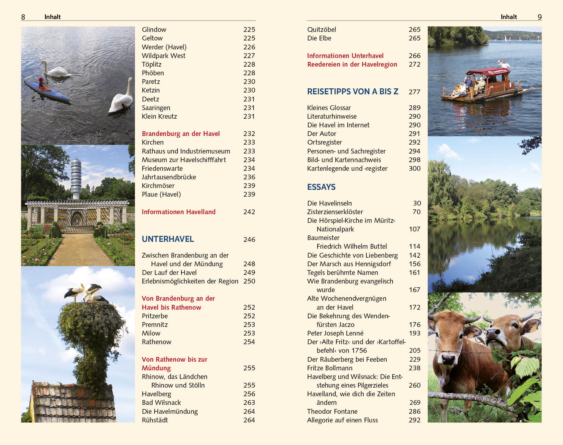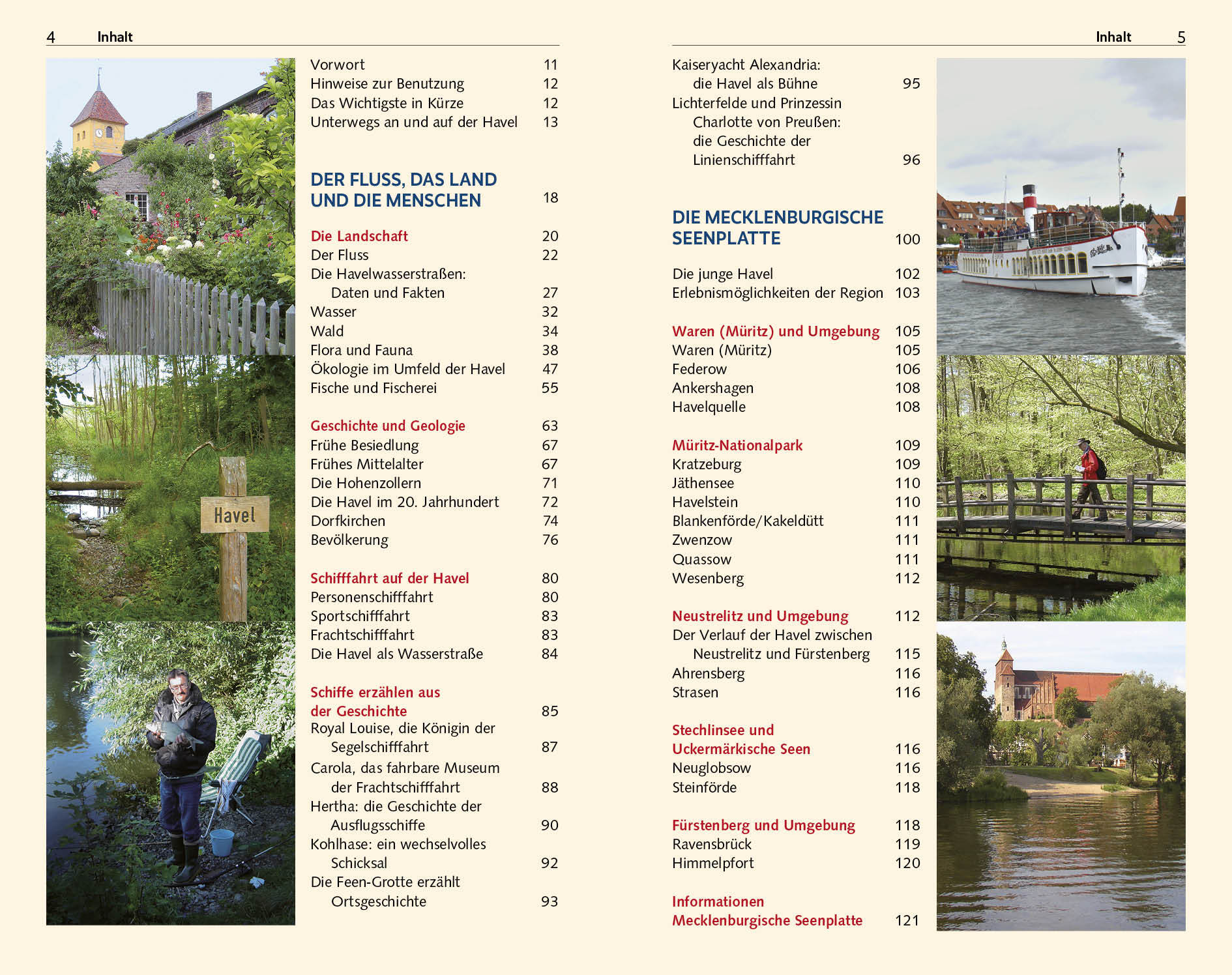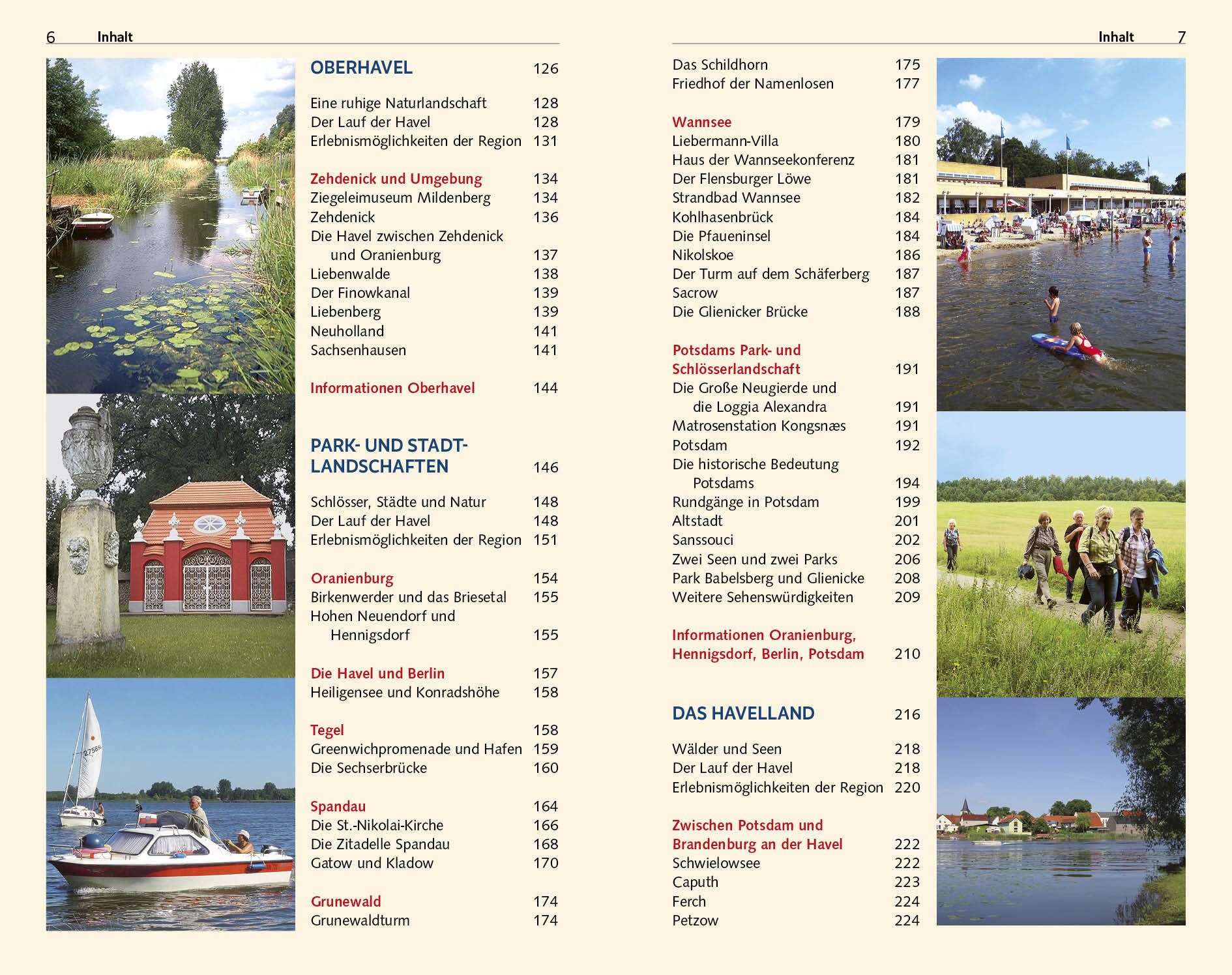 STÖRCHE, BIBER, FISCHREIHER Die Tierwelt an der Havel > Seite 38 STEINERNE ZEUGEN DER VERGANGENHEIT Alte Dorfkirchen > Seite 74 ROYAL LUISE, HERTHA, FEEN-GROTTE Schiffe erzählen aus der Geschichte > Seite 85 KLEINOD IN DER HAVELREGION Park und Schloss Liebenberg > Seite 139 DURCH SÜMPFE UND AUWÄLDER Das Briesetal > Seite 155 DER SCHÖNSTE UFERWEG Greenwichpromenade in Berlin-Tegel > Seite 159 MÄCHTIGE FESTUNG Die Zitadelle Spandau > Seite 168 EINZIGARTIGE PARK- UND SCHLÖSSERLANDSCHAFT Sanssouci > Seite 202 WEINBERGE IN BRANDENBURG Werder (Havel) > Seite 226 BEEINDRUCKENDE NORDDEUTSCHE BACKSTEINGOTIK Der Dom in Havelberg > Seite 257 Die Havel ist einer der attraktivsten Flüsse Deutsch-lands. Mit den mehr als 50 Seen, die sie bildet oder durchfließt, bildet die Havel eine einzigartige Wasserlandschaft, die Wassersportlern zahlreiche Möglichkeiten eröffnet. Fahrradtouristen können die Havel von der Quelle in Mecklenburg-Vorpommern bis zur Mündung in die Elbe auf dem Havelradweg entdecken, und für Wanderer sind verschiedene reizvolle Routen gegeben. Die hervorragende Infrastruktur der Region erlaubt sowohl mehrtägige Boots-, Rad- oder Wandertouren als auch einzelne Ausflüge zu den zahlreichen Sehenswürdigkeiten per Bahn, Bus oder Pkw. Dieser Reiseführer beschreibt alle Regionen und Städte an der Havel und gibt zahlreiche Tipps für (Wasser-)Wanderer und Rad- fahrer sowie Hinweise zu Einkehrmöglichkeiten, Unter-künften, Badestellen und Museen. >>> Weitere Reiseführer zu interessanten Regionen in Deutschland finden Sie auf der Website des Trescher Verlags.