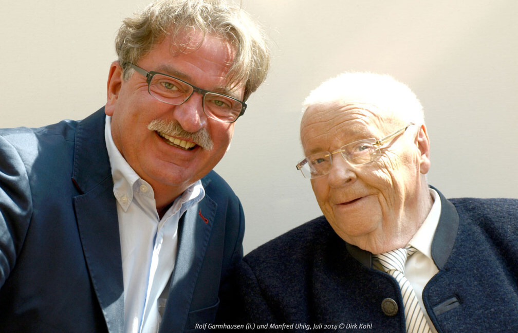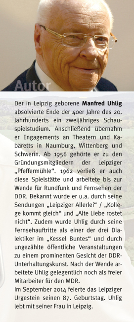 Manfred Uhlig (1927-2019) absolvierte Ende der 1940er Jahre ein Schauspiel-Studium und übernahm anschließend Engagements an Theatern und Kabaretts in Naumburg, Wittenberg und Schwerin. Ab 1956 gehörte er zum Ensemble der zwei Jahre zuvor gegründeten Leipziger Pfeffermühle. Am 30. Juni 1962 verließ er gemeinsam mit Helga Hahnemann, die er einst entdeckte diese Spielstätte und arbeitete, wie auch Henne, nun für den Rundfunk der DDR. Bekannt wurde er u. a. durch seine Sendungen Leipziger Allerlei, Kollege kommt gleich und Alte Liebe rostet nicht. Zudem wurde Uhlig durch seine Fernsehauftritte als einer der drei Dialektiker im Kessel Buntes und durch ungezählte öffentliche Veranstaltungen zu einem prominenten Gesicht der DDR-Unterhaltungskunst. Nach der Wende arbeitete er gelegentlich noch für den MDR. Ende Februar 2016 verstarb seine geliebte Frau Ruth, mit der er fast 70 Jahre zusammenlebte. Am 24.7.2019, im Alter von stolzen 91 Jahren, verstarb auch er in Leipzig.