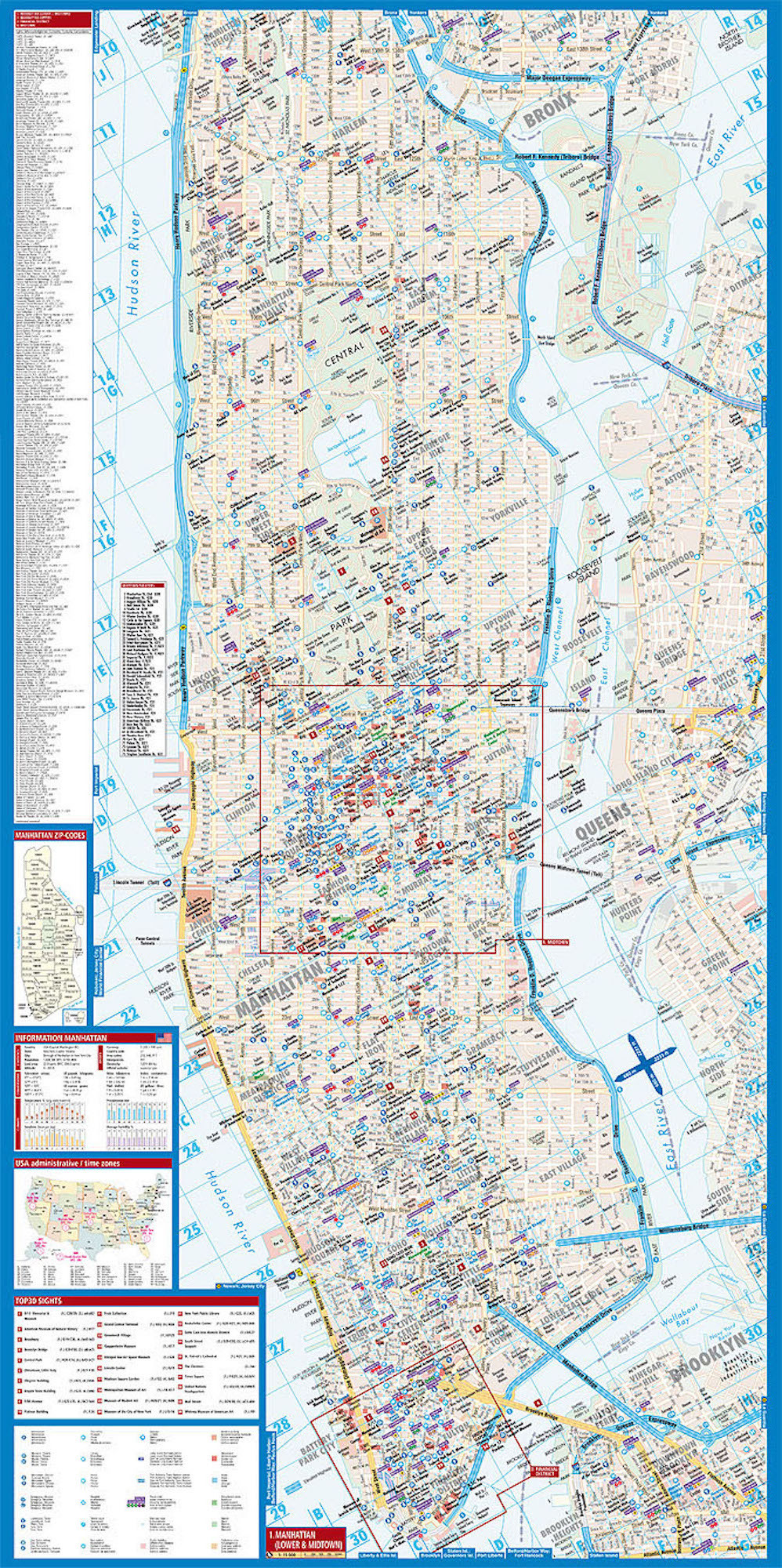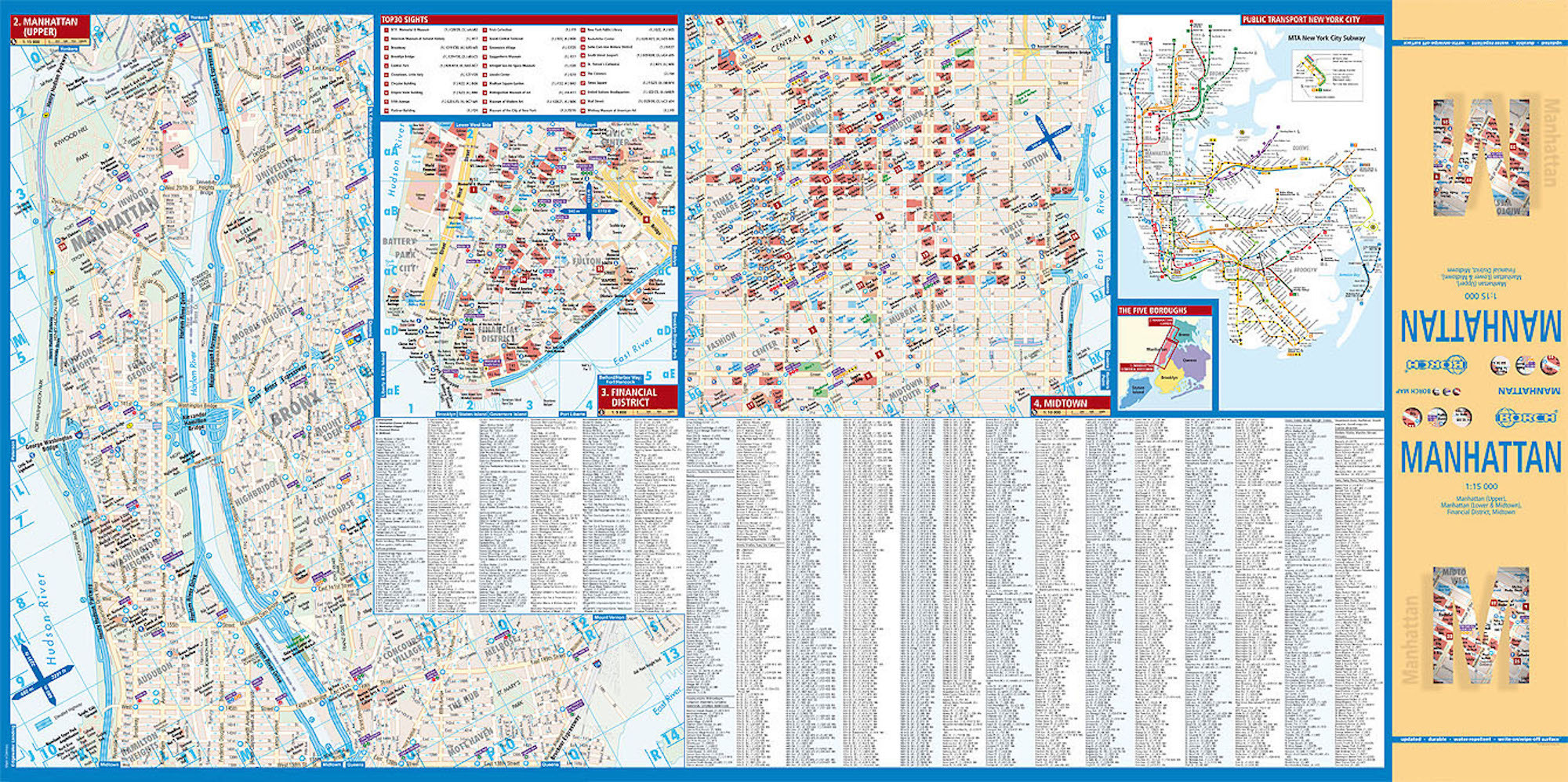 Our laminated and folded Borch Map of Manhattan in the 18th edition contains: Manhattan (Lower & Midtown) 1:15 000, Manhattan (Upper) 1:15 000, Midtown 1:10 000, Financial District 1:9 000, the public transport system and an administrative map of the USA w...