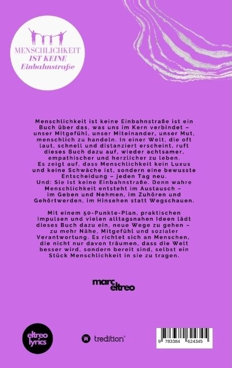 Menschlichkeit ist keine Einbahnstraße ist ein Buch über das, was uns im Kern verbindet unser Mitgefühl, unser Miteinander, unser Mut, menschlich zu handeln. In einer Welt, die oft laut, schnell und distanziert erscheint, ruft dieses Buch dazu auf, wieder acht...