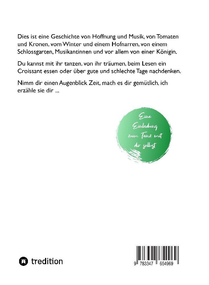 Dies ist eine Geschichte von Hoffnung und Musik, von Tomaten und Kronen, vom Winter und einem Hofnarren, von einem Schlossgarten, Musikantinnen und vor allem von einer Königin. Du kannst mit ihr tanzen, von ihr träumen, beim Lesen ein Croissant essen oder über...