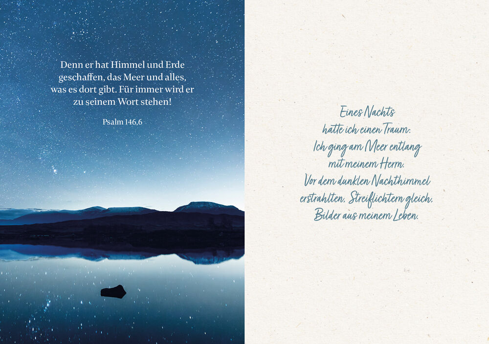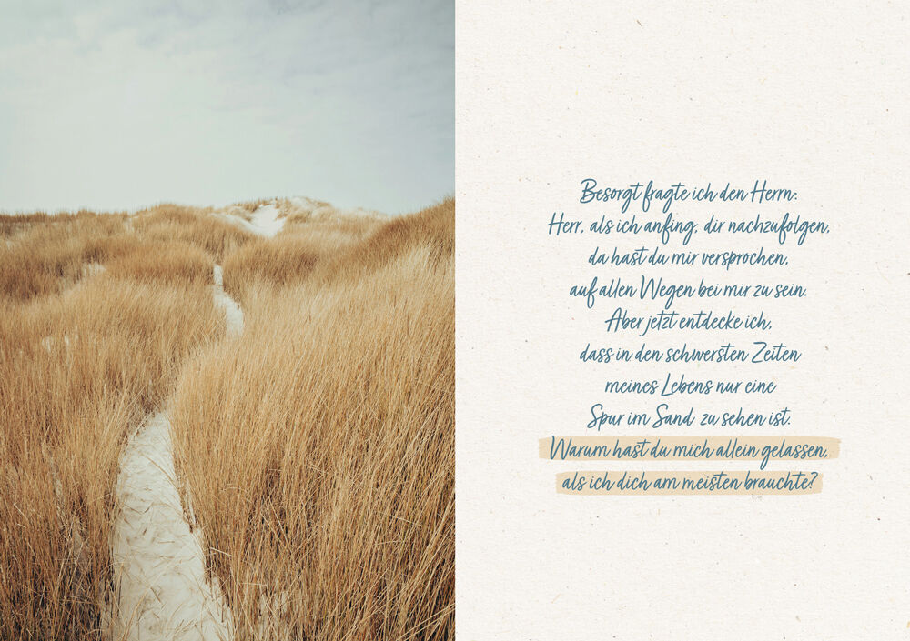 Das bekannte Gedicht "Spuren im Sand" von Margaret Fishback Powers hat schon vielen Menschen in aller Welt Ermutigung geschenkt. Sein Kerngedanke "Wo du nur eine Spur gesehen hast, da habe ich dich getragen" ist ein großartiges Versprechen Gottes an uns. Diese...