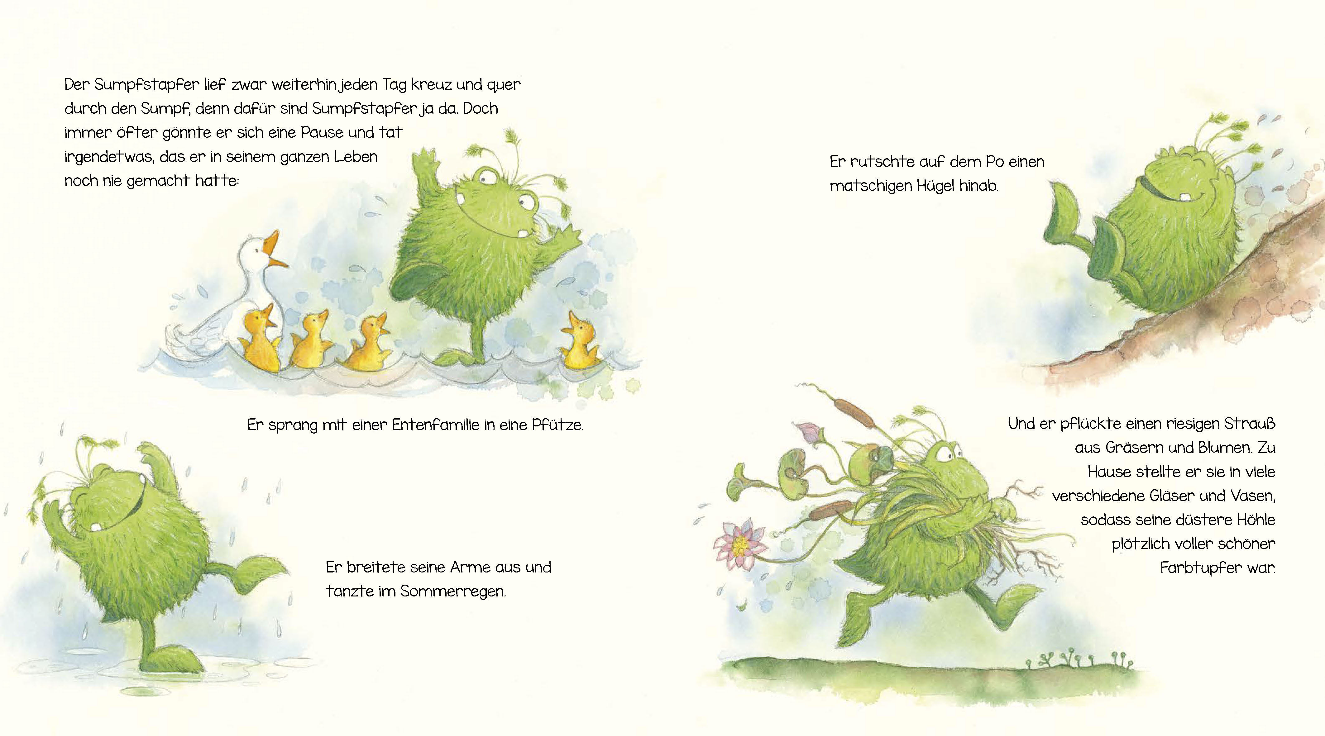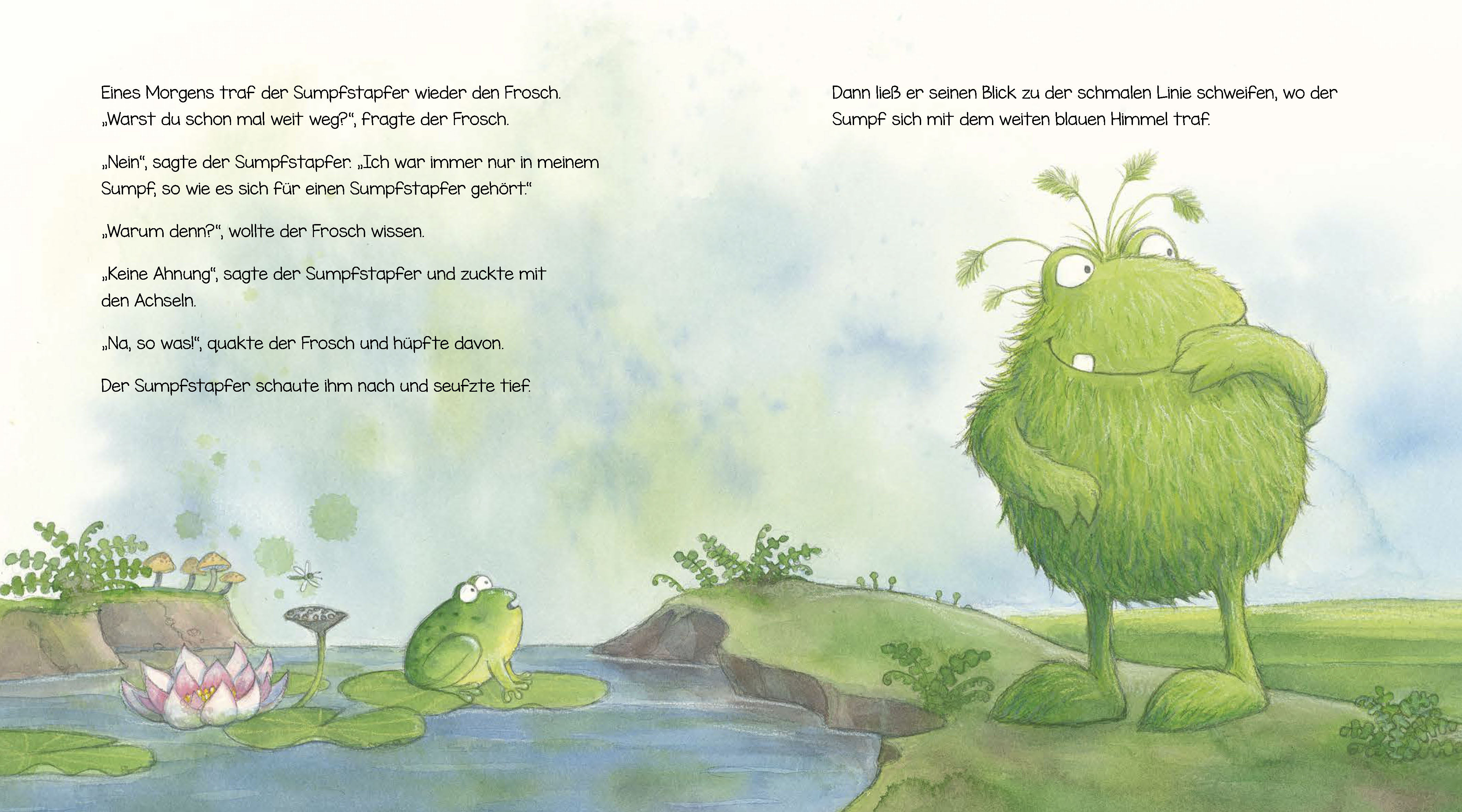 Jeden Tag geht der Sumpfstapfer seinem gewohnten Rhythmus nach: Stapfen, immer im selben Takt, Tag für Tag. Doch tief in ihm wächst der Wunsch nach Veränderung, nach etwas Neuem. Als er eines Morgens den Frosch trifft und zum ersten Mal im Leben eine Blume pfl...