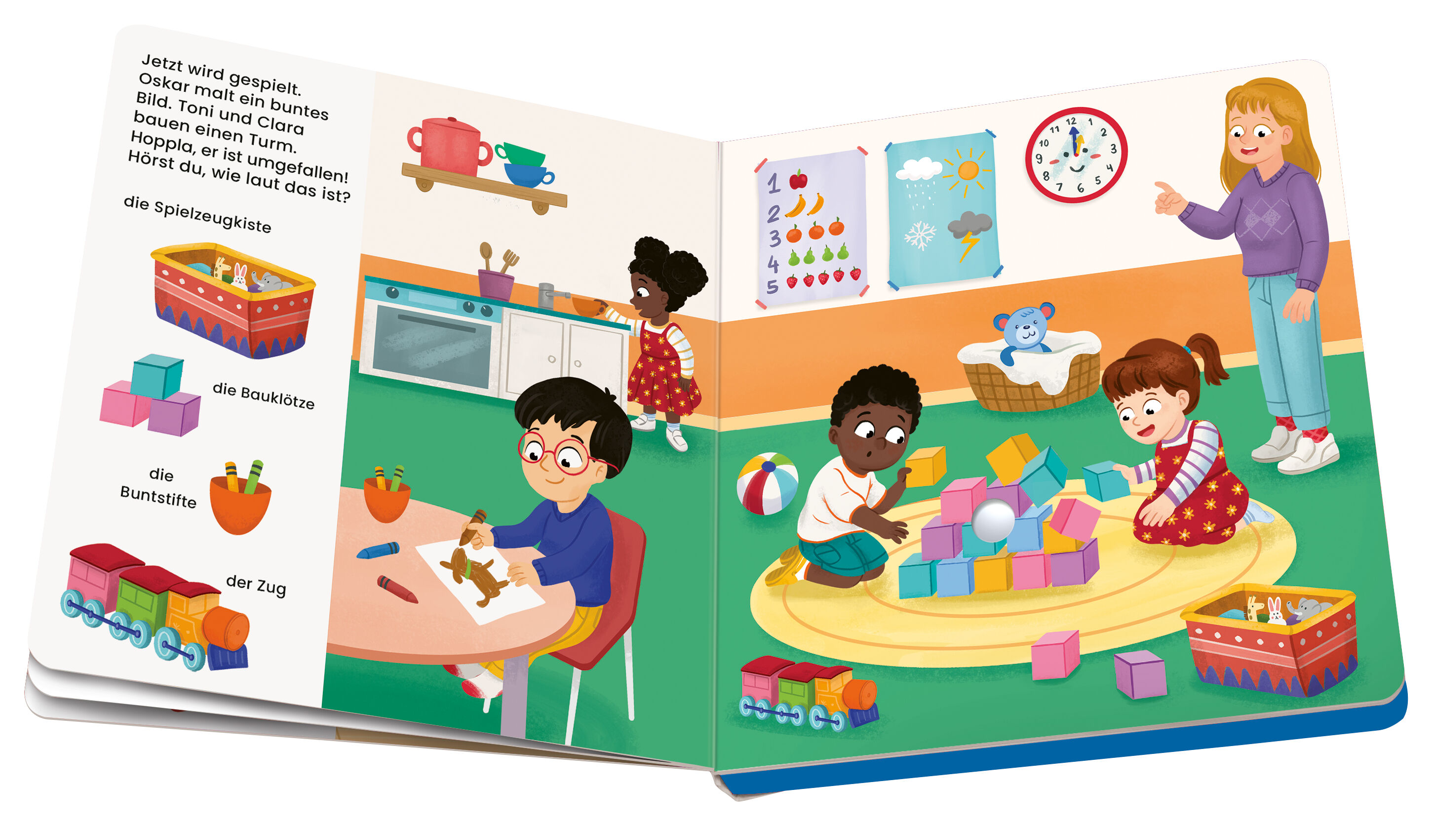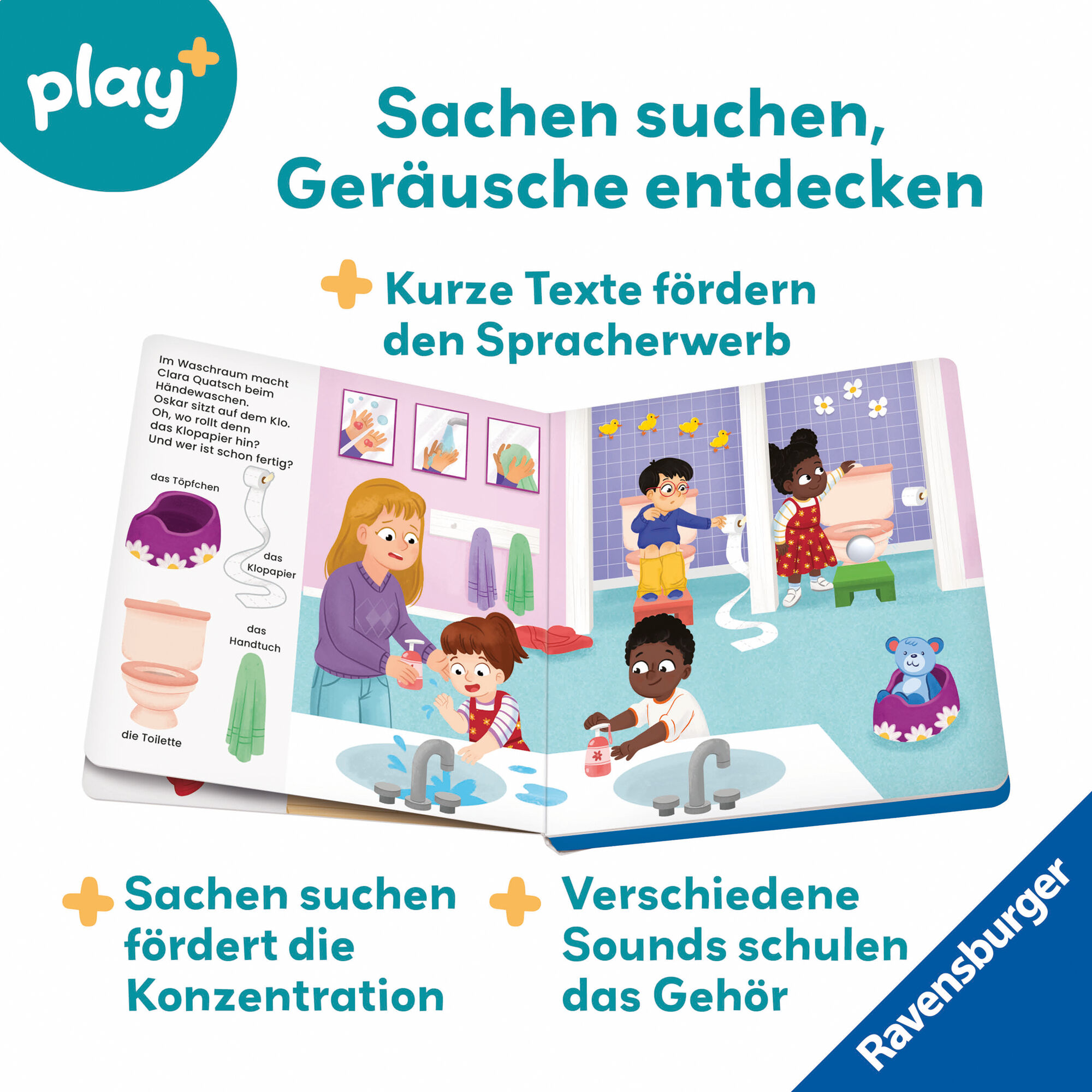 Großer Such-Spaß mit lustigen Kindergarten-Geräuschen Wer lacht da so fröhlich? Und wer macht Quatsch im Waschraum? Im Kindergarten gibt es viel Aufregendes zu suchen und finden. 5 lustige Geräusche machen die Entdeckungsreise im Gruppenraum, beim Essen und be...