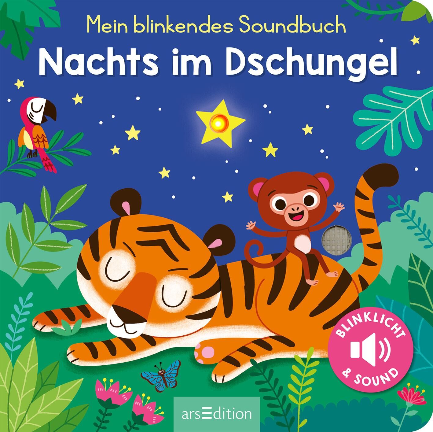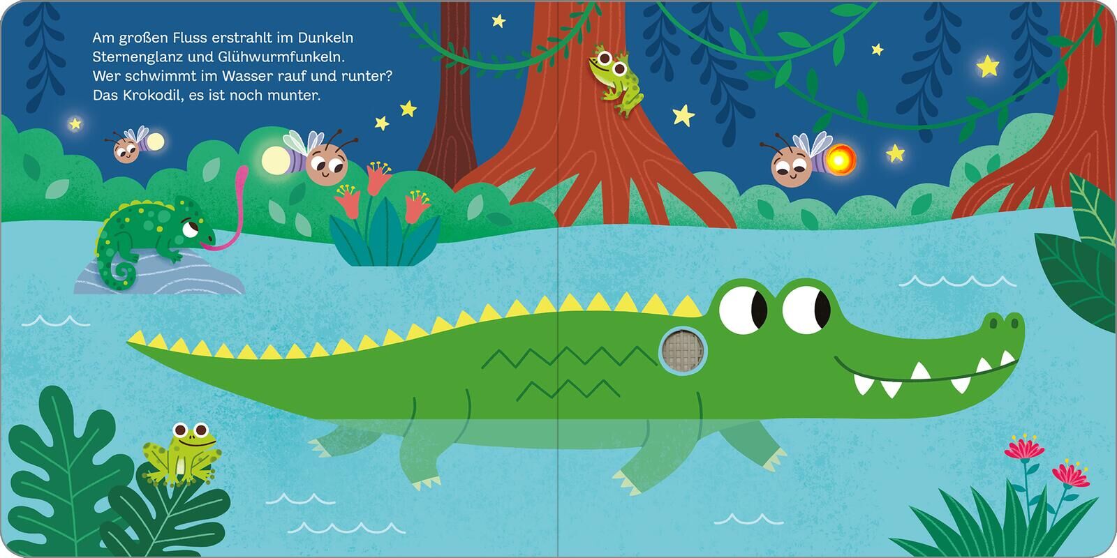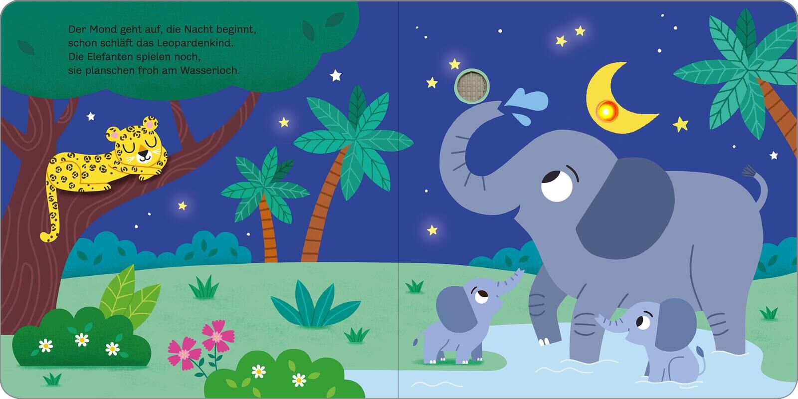 Hörst du den kleinen Affen? Im Dschungel kehrt langsam die Nacht ein. Elefant, Krokodil, Zebra und die Papageien sind noch wach, während am Himmel die Sterne und der Mond zu leuchten beginnen. Begleite die Tiere in diesem Buch und wünsche ihnen eine Gute Nach...