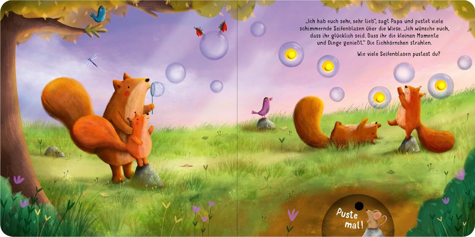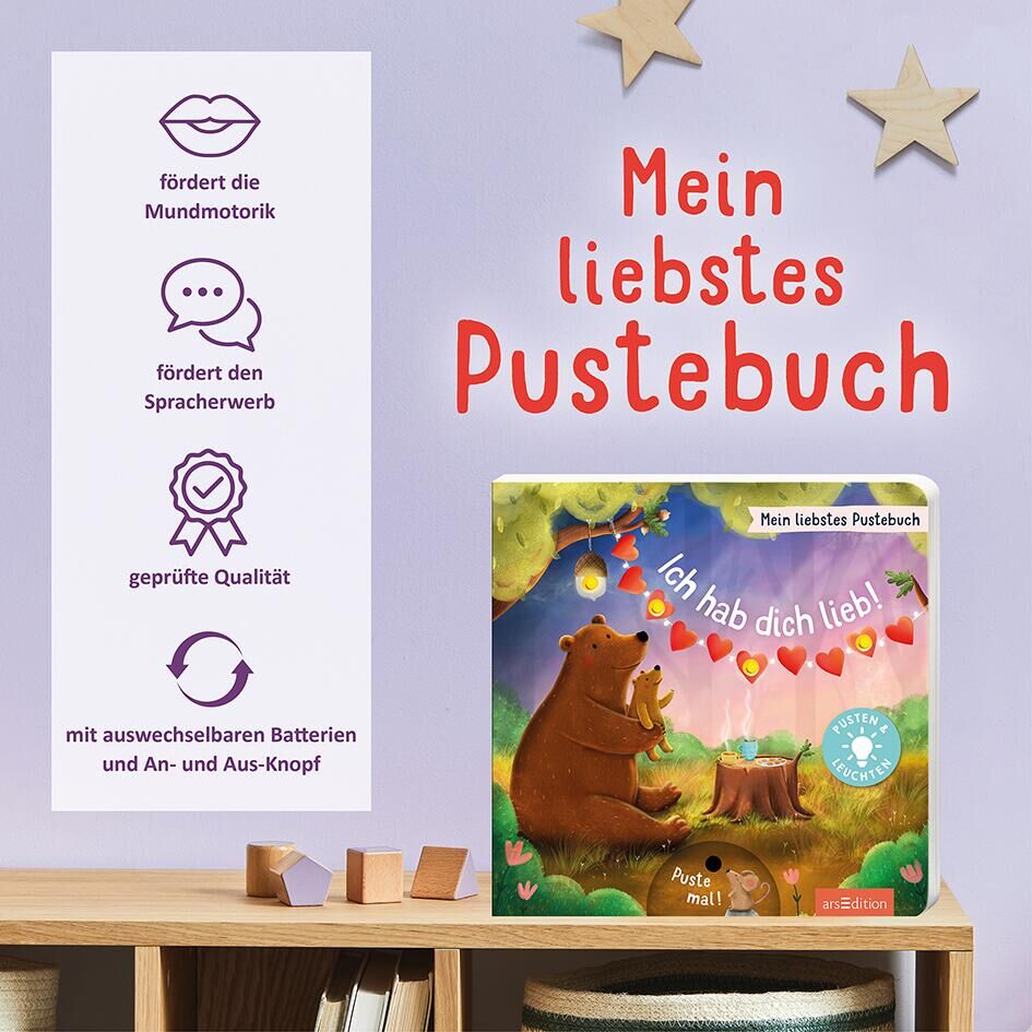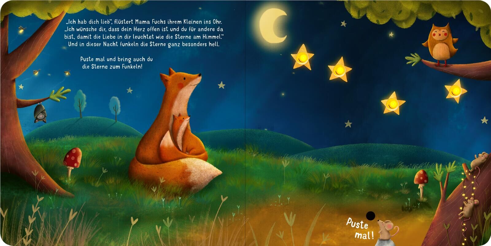 Das interaktive Liebhaben-Buch bietet magischen Pustespaß, der kleine Augen funkeln lässt. Durch das Pusten auf den im Buch integrierten Sensor beginnen auf jeder Seite 4 LED-Lichter zu leuchten. Spielerisch wird so die Mundmotorik und Konzentration trainiert. Ein zauberhafter Kleinkindbegleiter mit atmosphärischen Illustrationen für Kleinkinder ab 18 Monaten.