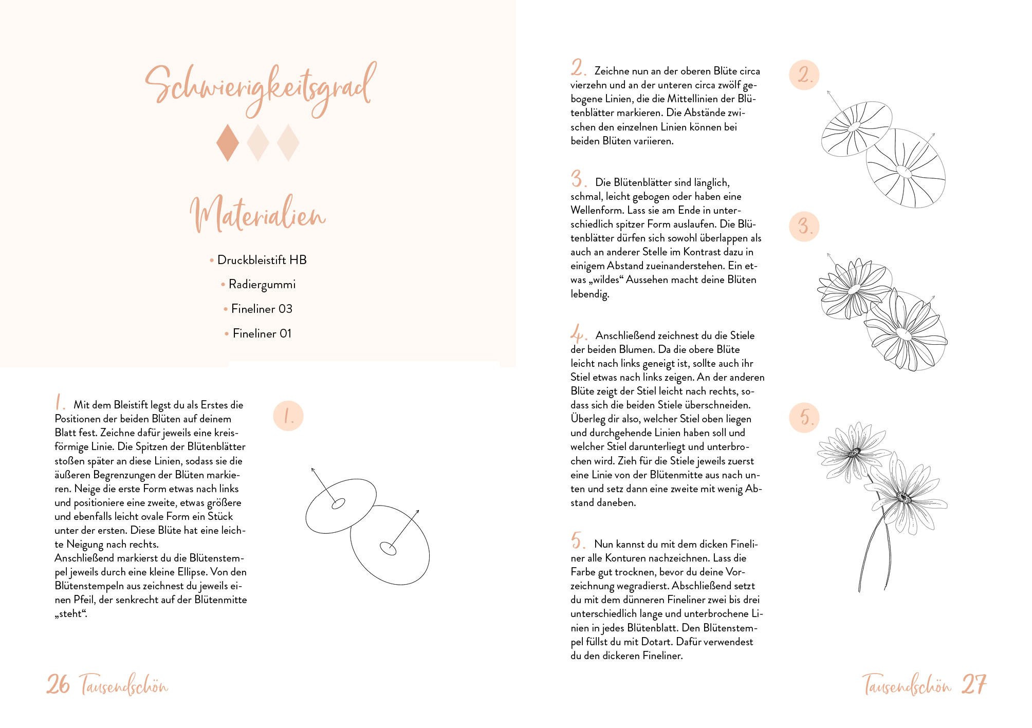 Designe deinen eigenen Blumen im Line-Art-Stil ganz einfach selbst! Du brauchst nur Papier und einen Fineliner und schon kann es losgehen. Im Grundlagenteil werden alle wichtigen Basics der Line-Art-Technik vermittelt sowie praktische Aufwärmübungen für deine...