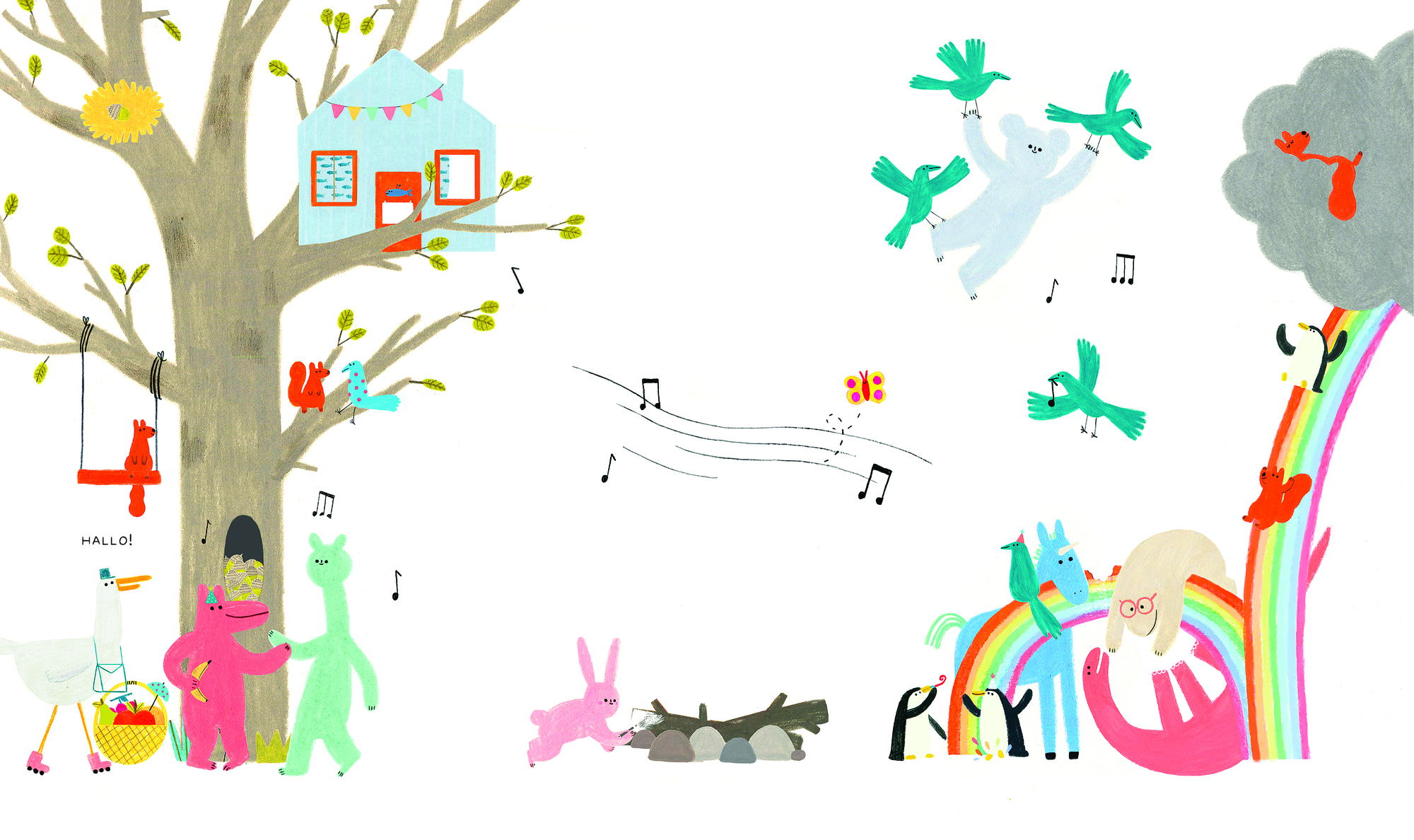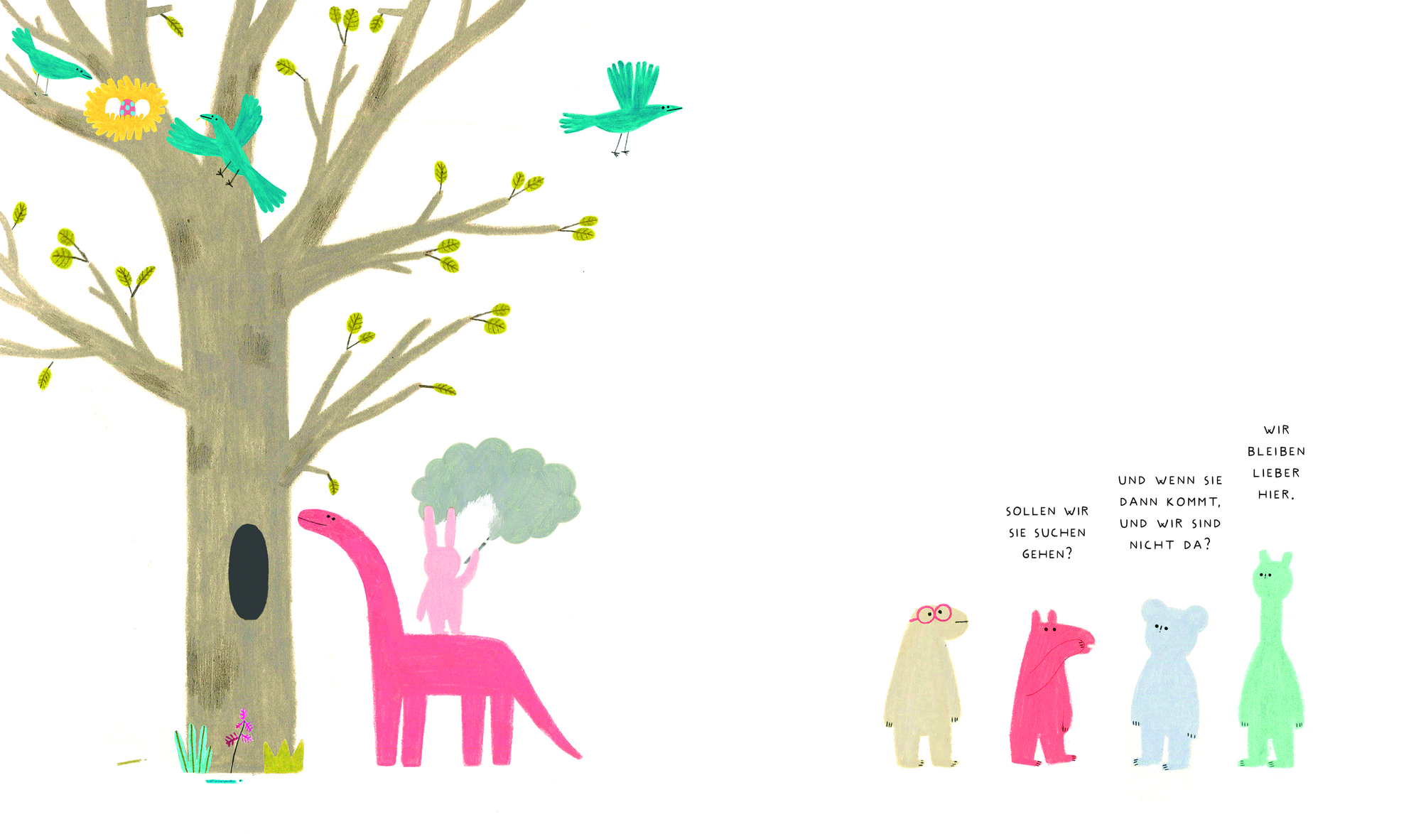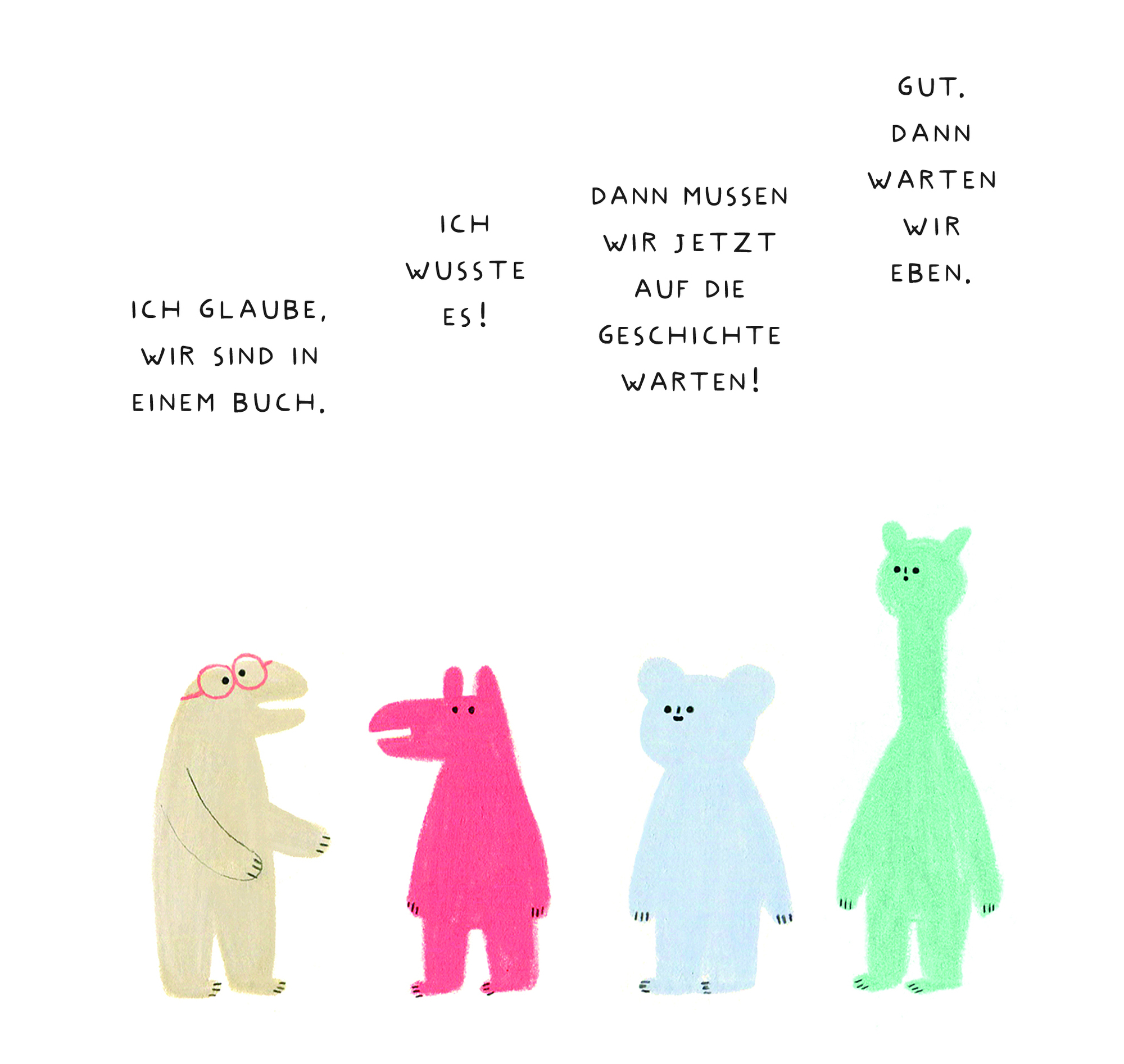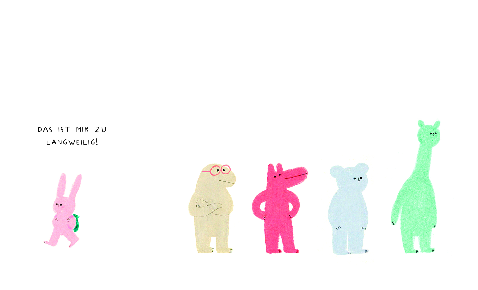 doch sie blieb nicht lange weiß. So beginnt die schräge, urkomische Geschichte, die sich langsam, Seite für Seite aufbaut. Erst noch schlicht, dann knallbunt. Die fünf putzigen Figuren, die sich ins Buch verirrt haben, wissen erst einmal nicht so recht, wo sie...