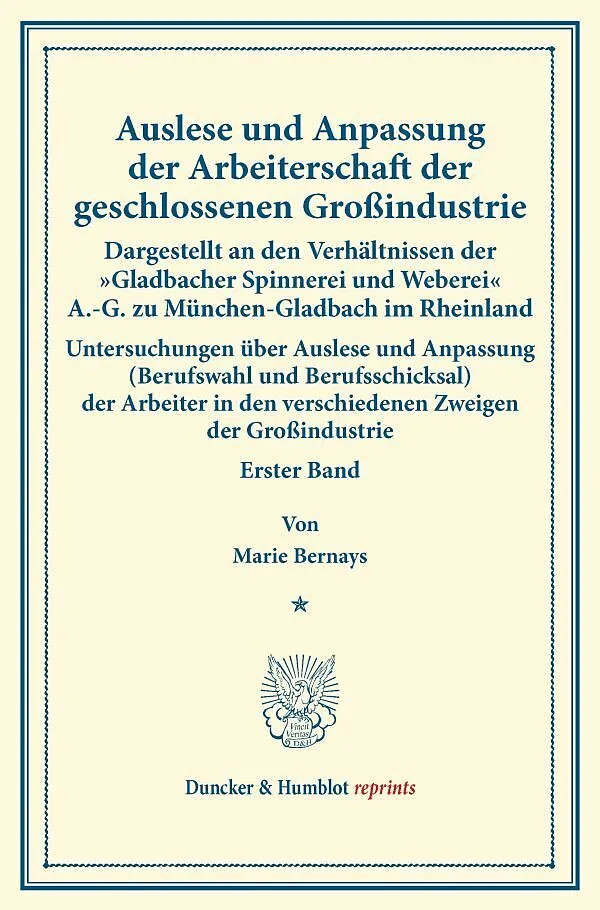 Als 1910 ihre Dissertation »Auslese und Anpassung der Arbeiterschaft der geschlossenen Großindustrie« bei Duncker & Humblot erschien, war Marie Bernays eine von wenigen promovierten Frauen im deutschen Kaiserreich. Für die Recherche ihrer Arbeit hatte die ...