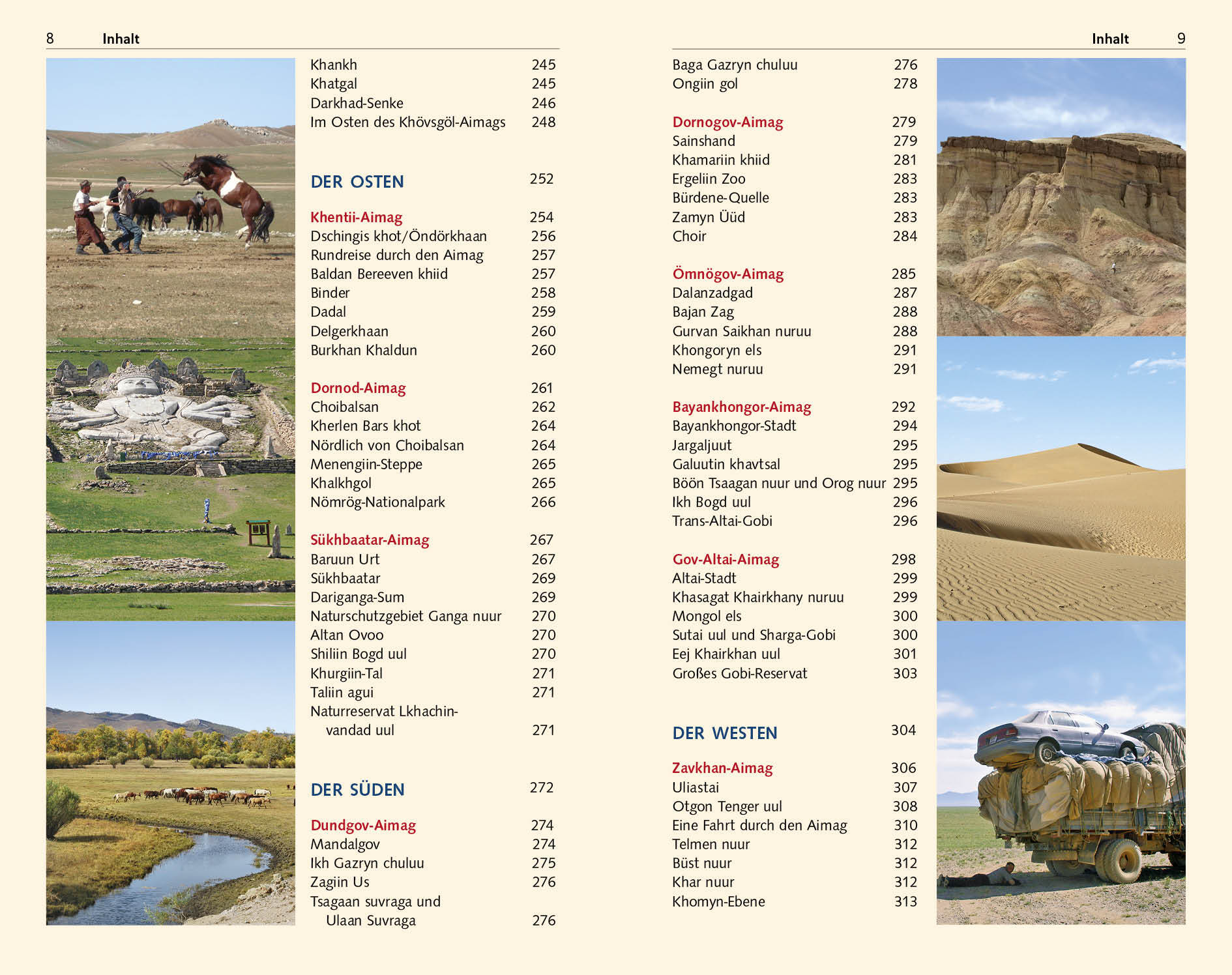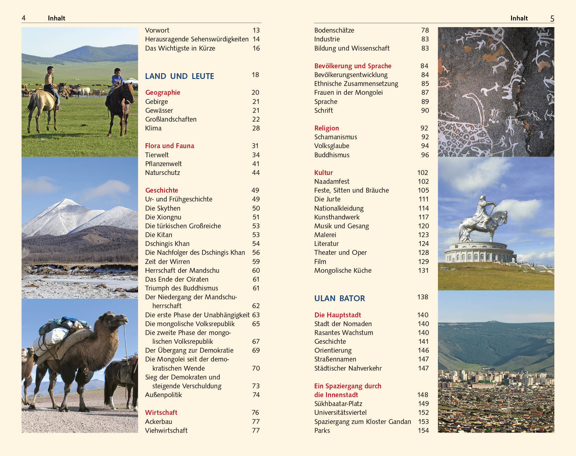 Seite 26 WILDKAMELE, ANTILOPEN, YAKS Die Tierwelt der Mongolei > Seite 34 PFERDERENNEN, RINGKÄMPFE UND BOGENSCHIEßEN Das Naadamfest > Seite 102 EINZIGARTIGE STIMMEN Obertongesang > Seite 120 DAS GRÖßTE KLOSTER DES LANDES Gandan > Seite 155 LEGENDÄRE HAUPTSTADT DES MONGOLISCHEN REICHES Karakorum > Seite 196 MYSTISCHES KLOSTER Amarbayasgalant > Seite 220 RELIKTE FERNER VERGANGENHEIT Hirsch- und Menschensteine > Seite 234 PERLE DES KHANGAI Der Khövsgöl-See > Seite 241 300 KILOMETER SAND Mongol els > Seite 300 Eine Reise in die Mongolei verspricht die Begegnung mit unberührter Natur und der Gastfreundschaft der Mongolen. Die lebendige Hauptstadt Ulan Bator fasziniert durch ihre Kontraste aus Tradition und Moderne, im Norden und Westen der Mongolei laden atemberaubende Berglandschaften zu Wanderungen oder Reittouren ein. Im Süden und Osten gibt es neben den vielfältigen Landschaften der Gobi Hochsteppen bizarre Felsformationen, erloschene Vulkane und riesige Sand-dünenfelder zu entdecken. Und überall finden sich Spuren der jahrtausendealten Geschichte des Landes. Dieser Reiseführer gibt zahlreiche Informationen zur Vorbereitung einer Reise in die Mongolei. Tipps zu Unterkünften und Versorgungsmöglichkeiten auch in entlegenen Regionen ermöglichen einen unvergesslichen Aufenthalt. >>> Weitere Reiseführer zu Asien finden Sie auf der Website des Trescher Verlags.