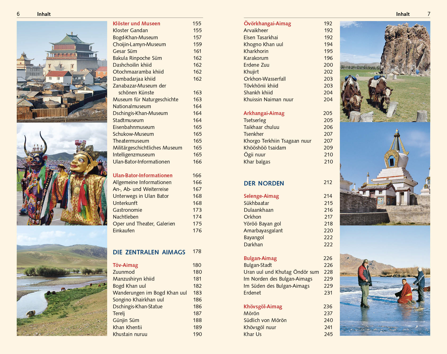 Vorwort 13 Herausragende Sehenswürdigkeiten 14 Das Wichtigste in Kürze 16 LAND UND LEUTE 18 Geographie 20 Gebirge 21 Gewässer 21 Großlandschaften 22 Klima 28 Flora und Fauna 31 Tierwelt 34 Pflanzenwelt 41 Naturschutz 44 Geschichte 49 Ur- und Frühgeschichte 49 Die Skythen 50 Die Xiongnu 51 Die türkischen Großreiche 53 Die Kitan 53 Dschingis Khan 54 Die Nachfolger des Dschingis Khan 56 Zeit der Wirren 59 Herrschaft der Mandschu 60 Das Ende der Oiraten 61 Triumph des Buddhismus 61 Der Niedergang der Mandschuherrschaft 62 Die erste Phase der Unabhängigkeit 63 Die mongolische Volksrepublik 65 Die zweite Phase der mongolischen Volksrepublik 67 Der Übergang zur Demokratie 69 Die Mongolei seit der demokratischen Wende 70 Sieg der Demokraten und steigende Verschuldung 73 Außenpolitik 74 Wirtschaft 76 Ackerbau 77 Viehwirtschaft 77 Bodenschätze 78 Industrie 83 Bildung und Wissenschaft 83 Bevölkerung und Sprache 84 Bevölkerungsentwicklung 84 Ethnische Zusammensetzung 85 Frauen in der Mongolei 87 Sprache 89 Schrift 90 Religion 92 Schamanismus 92 Volksglaube 94 Buddhismus 96 Kultur 102 Naadamfest 102 Feste, Sitten und Bräuche 105 Die Jurte 111 Nationalkleidung 114 Kunsthandwerk 117 Musik und Gesang 120 Malerei 123 Literatur 124 Theater und Oper 128 Film 129 Mongolische Küche 131 ULAN BATOR 138 Die Hauptstadt 140 Stadt der Nomaden 140 Rasantes Wachstum 140 Geschichte 141 Orientierung 146 Straßennamen 147 Städtischer Nahverkehr 147 Ein Spaziergang durch die Innenstadt 148 Sükhbaatar-Platz 149 Universitätsviertel 152 Spaziergang zum Kloster Gandan 153 Parks 154 Klöster und Museen 155 Kloster Gandan 155 Bogd-Khan-Museum 157 Choijin-Lamyn-Museum 159 Gesar Süm 161 Bakula Rinpoche Süm 162 Dashchoilin khiid 162 Otochmaaramba khiid 162 Dambadarjaa khiid 162 Zanabazar-Museum der schönen Künste 163 Museum für Naturgeschichte 163 Nationalmuseum 164 Dschingis-Khan-Museum 164 Stadtmuseum 164 Eisenbahnmuseum 165 Schukow-Museum 165 Theatermuseum 165 Militärgeschichtliches Museum 165 Intelligenzmuseum 165 Ulan-Bator-Informationen 166 Ulan-Bator-Informationen 166 Allgemeine Informationen 166 An-, Ab- und Weiterreise 167 Unterwegs in Ulan Bator 168 Unterkunft 168 Gastronomie 173 Nachtleben 174 Oper und Theater, Galerien 175 Einkaufen 176 DIE ZENTRALEN AIMAGS 178 Töv-Aimag 180 Zuunmod 180 Manzushiryn khiid 181 Bogd Khan uul 182 Wanderungen im Bogd Khan uul 183 Songino Khairkhan uul…
