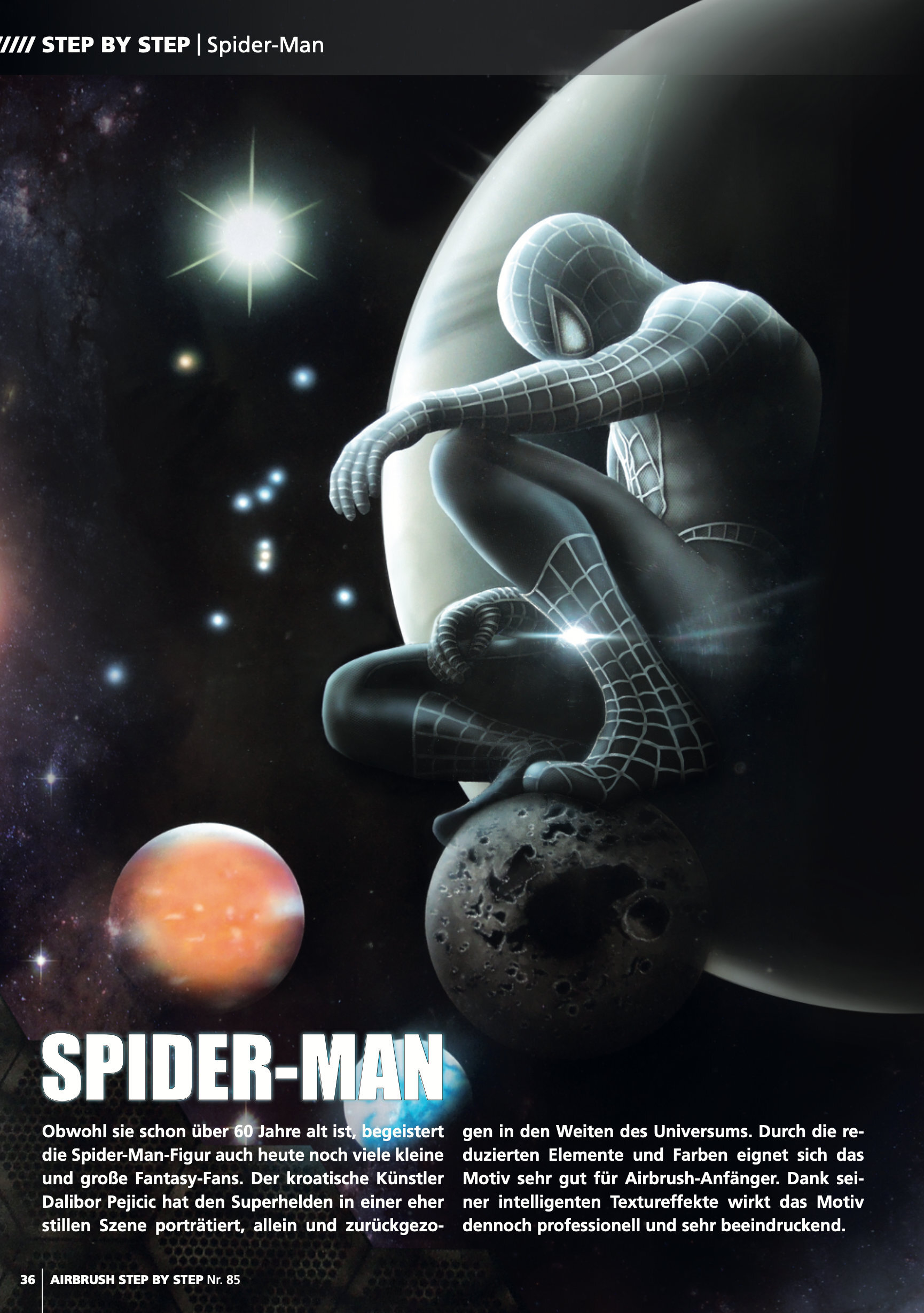 Step by Steps: Stillleben von Timo Scheld Effektvolles Mischtechnik-Porträt von Marissa Oosterlee Fantasy-Illustration von Jeffrey Martinez Spider-Man-Szene von Dalibor Pejicic Interviews: Nostalgische Kino-Kunst von Andreas Birk Airbrush meets Palace AMG Tech...