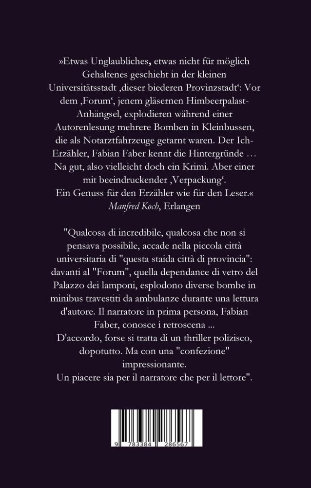 »Etwas Unglaubliches, etwas nicht für möglich Gehaltenes geschieht in der kleinen Universitätsstadt dieser biederen Provinzstadt': Vor dem Forum', jenem gläsernen Himbeerpalast-Anhängsel, explodieren während einer Autorenlesung mehrere Bomben in Kleinbussen, d...
