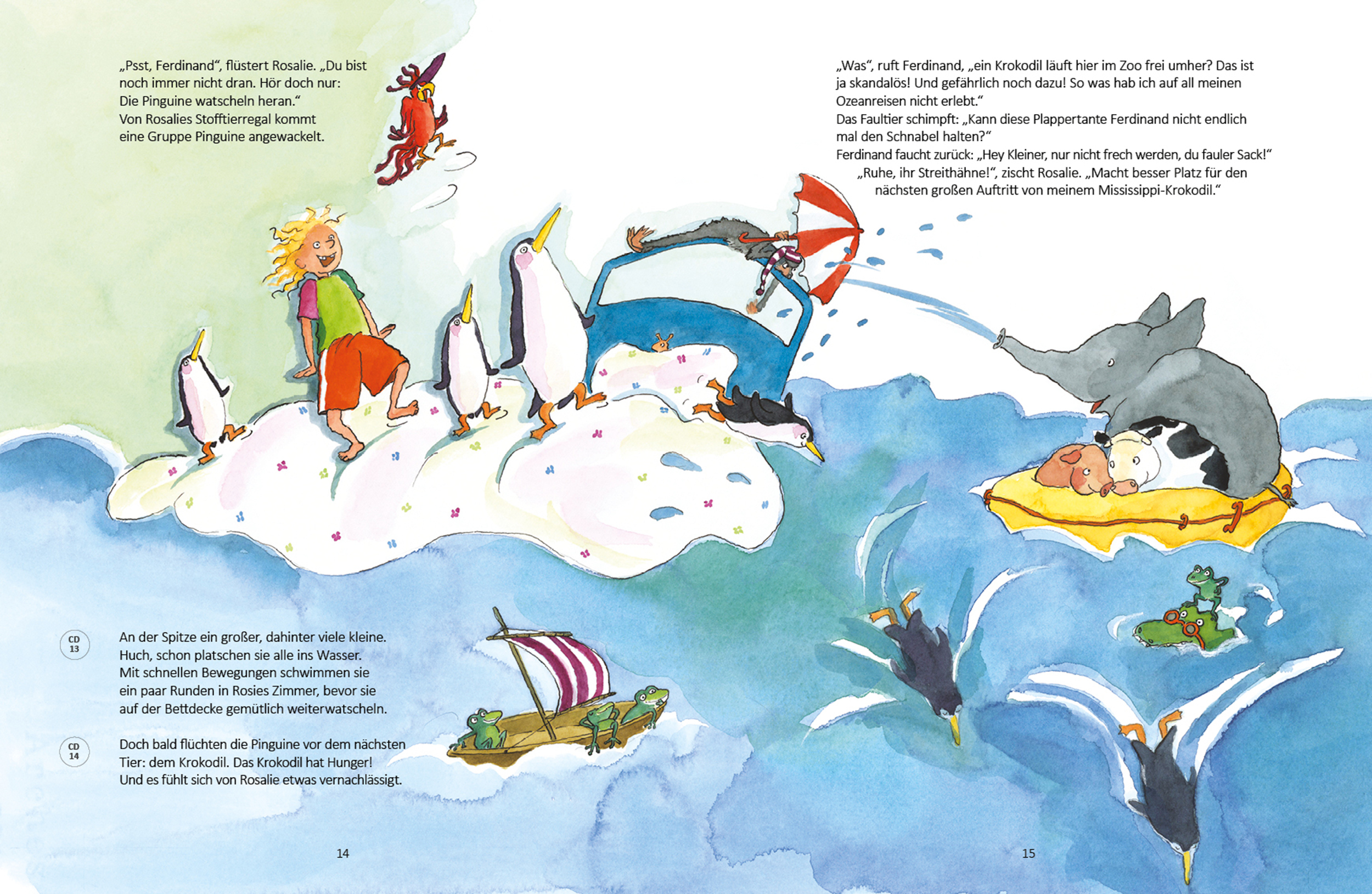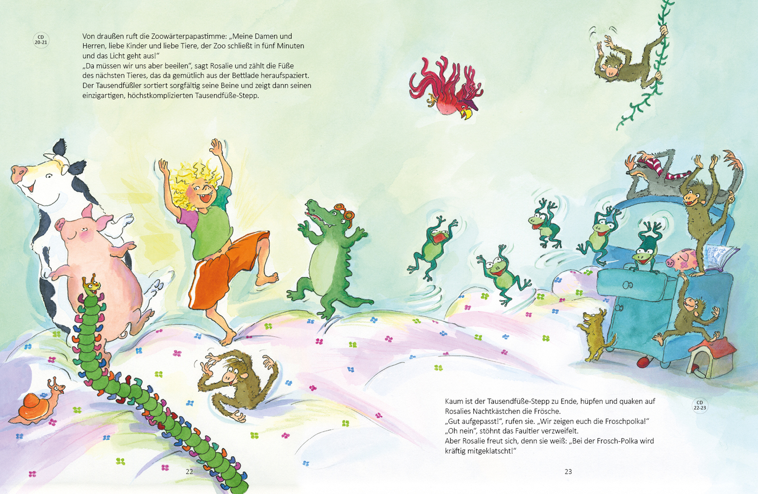 Zeit zum Schlafengehen! Aber Rosalie ist noch gaaar nicht müde ... Auch der Seefahrer-Papagei, das Faultier, die Affen und alle anderen Stofftiere sind noch putzmunter. Da wird aus Rosalies Bett ein musikalischer Zoo, den der Elefant mit lautem Trompetenzauber...