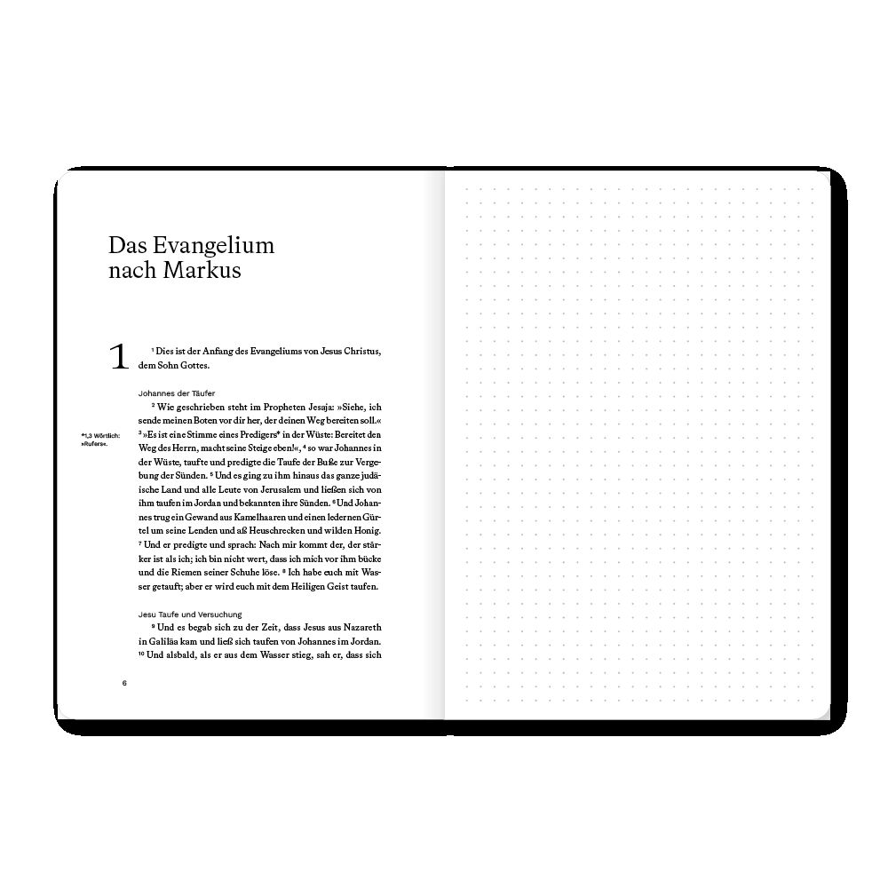 Bibeltext und Notizseite mit Punktraster ideal für die Bibellese, Kleingruppe oder Predigt. Hochwertig ausgestattet, viel Platz zum Schreiben. Dieses Bibeljournal kombiniert den vollständigen Bibeltext eines biblischen Buches (Luther 2017) und eine gegenüberli...