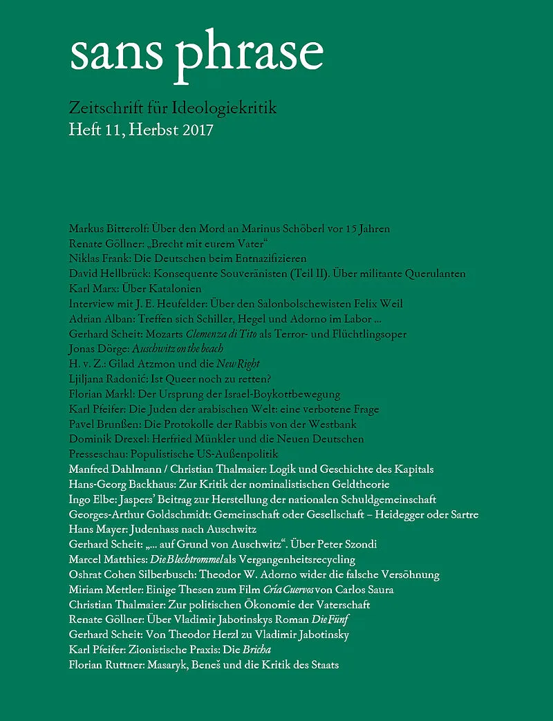 Markus Bitterolf: Vor ein paar Jahren sind wir zum schönsten Dorf: Deutschlands gewählt worden. Über den Mord an Marinus Schöberl vor 15 Jahren Renate Göllner: Brecht mit eurem Vater. Bruch und falsche Versöhnung in der postnazistischen Familie Niklas Frank: D...Markus Bitterolf: Vor ein paar Jahren sind wir zum schönsten Dorf: Deutschlands gewählt worden. Über den Mord an Marinus Schöberl vor 15 Jahren Renate Göllner: Brecht mit eurem Vater. Bruch und falsche Versöhnung in der postnazistischen Familie Niklas Frank: Dunkle Seele, feiges Maul. Wie skandalös und komisch sich: die Deutschen beim Entnazifizieren reinwaschen David Hellbrück: Konsequente Souveränisten (Teil II). Über Staatsverweigerer, Reichsbürger und Selbstverwalter als militante Querulanten Karl Marx: [Über einige Voraussetzungen der Unabhängigkeitsbewegung in Katalonien] Interview mit J. E. Heufelder: Über den Salonbolschewisten Felix Weil Adrian Alban: Treffen sich Schiller, Hegel und Adorno im Labor Zum Max-Planck-Institut für empirische Ästhetik Gerhard Scheit: Mozarts Clemenza di Tito als Terror- und Flüchtlingsoper. Kleiner Rückblick auf den Welttheaterschwindel von 2017 Jonas Dörge: Auschwitz on the beach oder: Niemand hatte die Absicht, ein Gedicht zu lesen H. v. Z.: Verjazzter Parsifal oder: Weininger spielt heute Saxophon. Gilad Atzmon und die New Right Ljiljana Radoni: Ist Queer noch zu retten? Florian Markl: Der Ursprung der Israel-Boykottbewegung Karl Pfeifer: Die Juden der arabischen Welt: eine verbotene Frage Pavel Brunßen: Die Protokolle der Rabbis von der Westbank. Verschwörung: und Wasservergiftung im 14. und 21. Jahrhundert Dominik Drexel: Herfried Münkler und die Neuen Deutschen. Zur politischen Vermittlung des Islamismus Presseschau: Populistische Außenpolitik. Kleine Presseschau zur Frage der US-Hegemonie Manfred Dahlmann / Christian Thalmaier: Anmerkungen zur Logik und Geschichte des Kapitals. Ein Gespräch (1. Teil) Hans-Georg Backhaus: Zur Kritik der nominalistischen Geldtheorie Ingo Elbe: Die Reinigung macht uns frei. Karl Jaspers' Beitrag zur Herstellung der nationalen Schuldgemeinschaft durch Akzeptanz des Kollektivschuldbegriffs Georges-Arthur Goldschmidt: Ist da jemand? Gemeinschaft oder Gesellschaft Heidegger oder Sartre Vorbemerkung: Shylock unter den Staaten. Vorbemerkung zum letztenKapitel von Hans Mayers Außenseiter Hans Mayer: Judenhass nach Auschwitz Gerhard Scheit: auf Grund von Auschwitz. Über Peter Szondi Marcel Matthies: Die Blechtrommel als avantgardistischer Roman des Vergangenheitsrecyclings Oshrat Cohen Silberbusch: Rire à tout prix? Theodor W. Adorno wider die falsche Versöhnung Miriam Mettler: Über Wut und Würde der Rabenkinder. Einige Thesen zum Film Cría Cuervos von Carlos Saura Christian Thalmaier: Muss ein lieber Vater wohnen. Zur politischen Ökonomie der Vaterschaft Renate Göllner: Auf der Suche nach der verlorenen Stadt.Über Vladimir Jabotinskys Roman Die Fünf Gerhard Scheit: Die Bewaffnung des Gestors: Von Theodor Herzl zu Vladimir Jabotinsky. (Theorie des Zionismus, Kritik des Antizionismus 1. Teil) Karl Pfeifer: Zionistische Praxis: Die Bricha Florian Ruttner: Pangermanismus als Behemoth. Zur Bedeutung von Masaryk und Bene für die Kritik des Staats