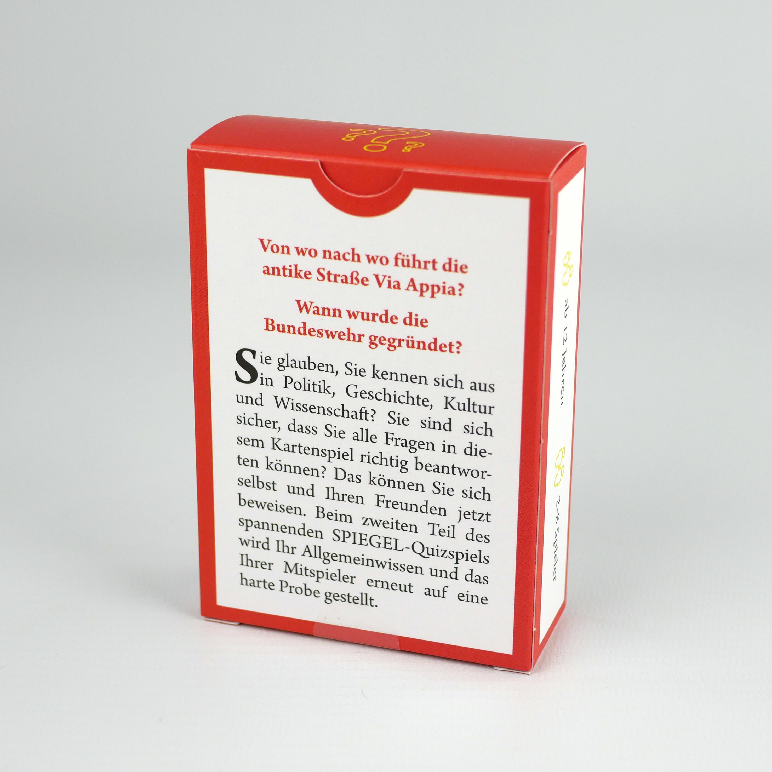 Von wo nach wo führt die antike Straße Via Appia? Wann wurde die Bundeswehr gegründet? Sie glauben, Sie kennen sich aus in Politik, Geschichte, Kultur und Wissenschaft? Sie sind sich sicher, dass Sie die 140 Fragen in diesem Kartenspiel richtig beantworten kön...