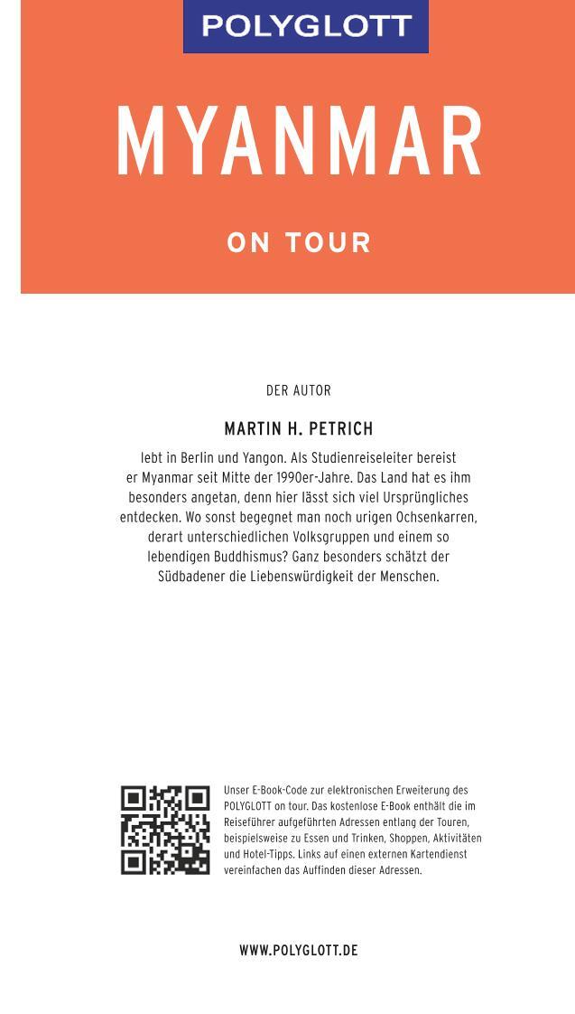 Persönlich & mittendrin! Entspanntes und unabhängiges Reisen mit dem Reiseführer POLYGLOTT on tour Myanmar, der Sie direkt ins Leben der Locals eintauchen lässt. Der Autor Martin H. Petrich führt in abwechslungsreichen Touren durch den südostasiatischen St...