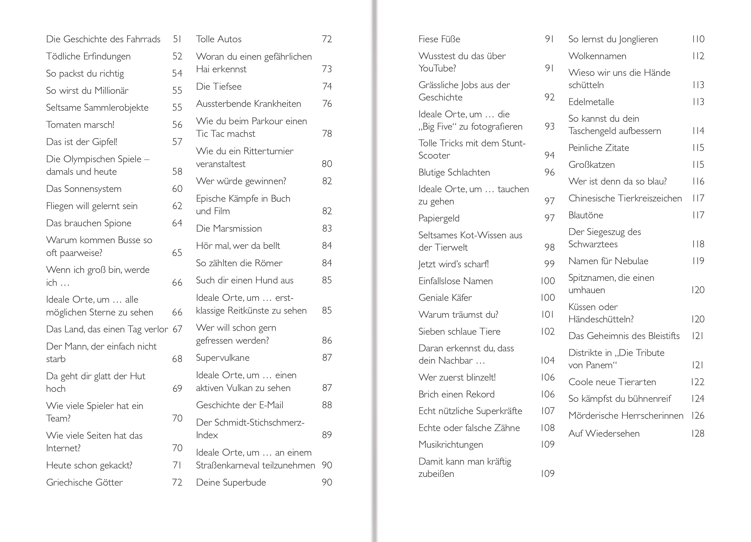 Spannende und unglaubliche Fakten, die Jungs zum Staunen bringen: • Welches Raubtier hat die meisten Zähne? • Wie lange dauert eine Reise zum Mars? • Und wie finde ich heraus, ob mein Nachbar ein Alien ist? Kurze Texte und witzige Illustrationen...