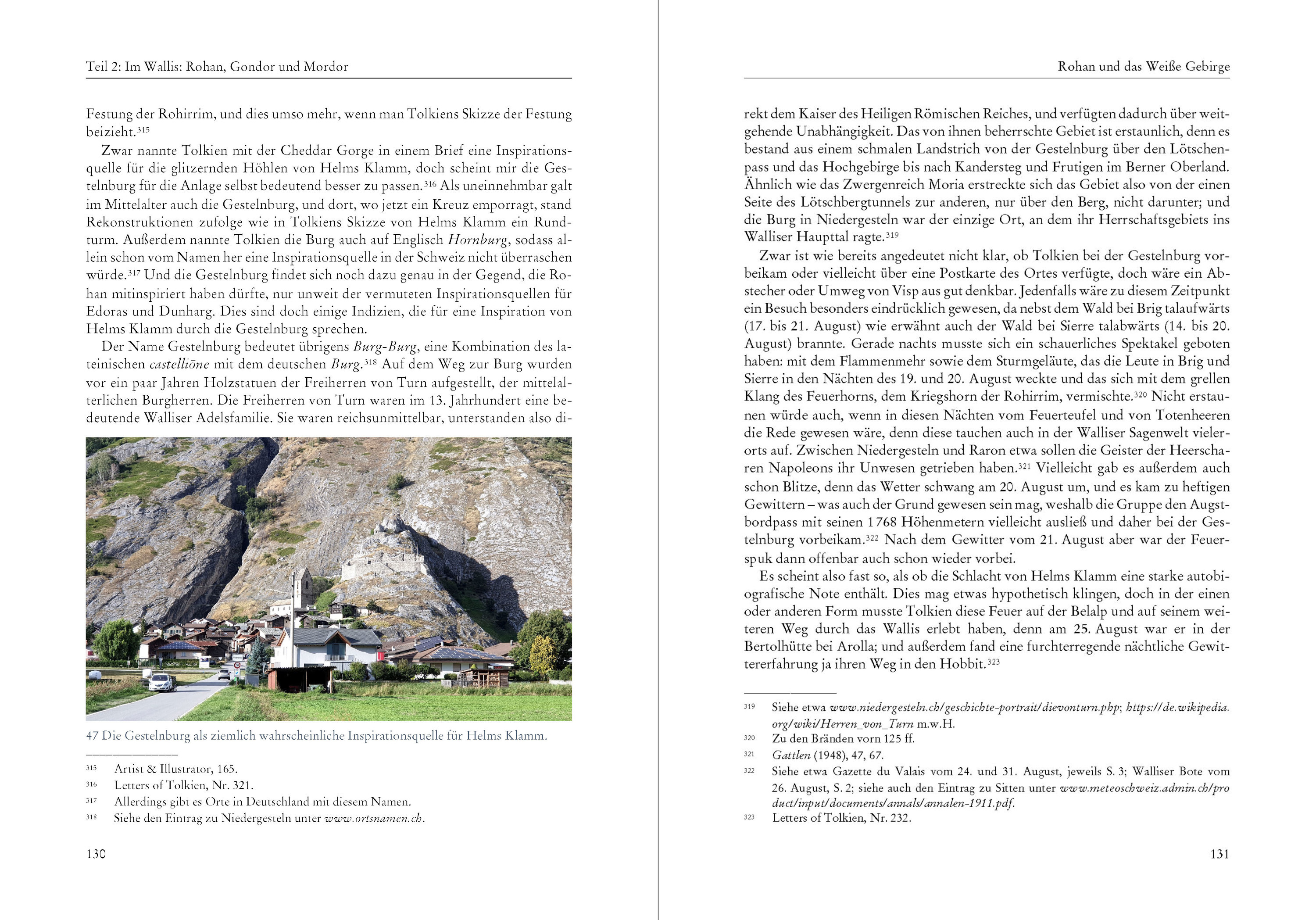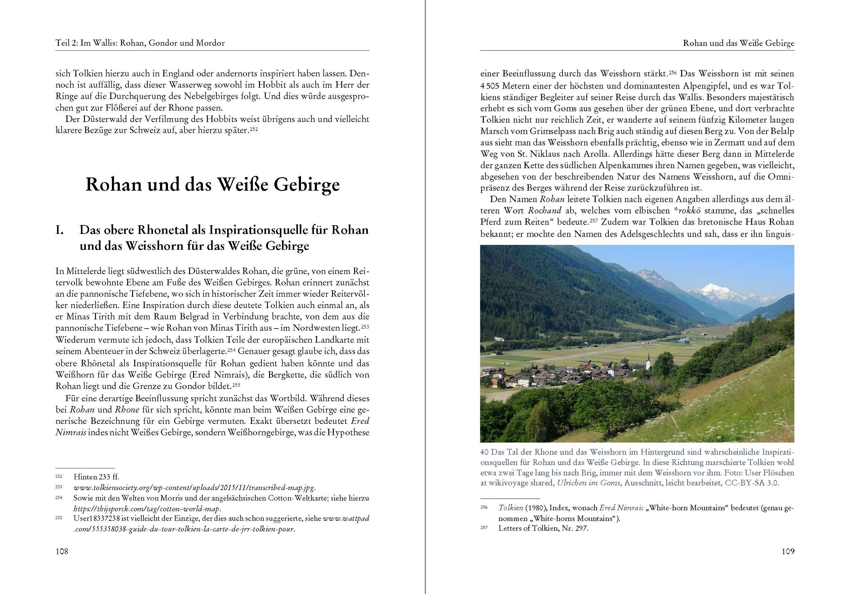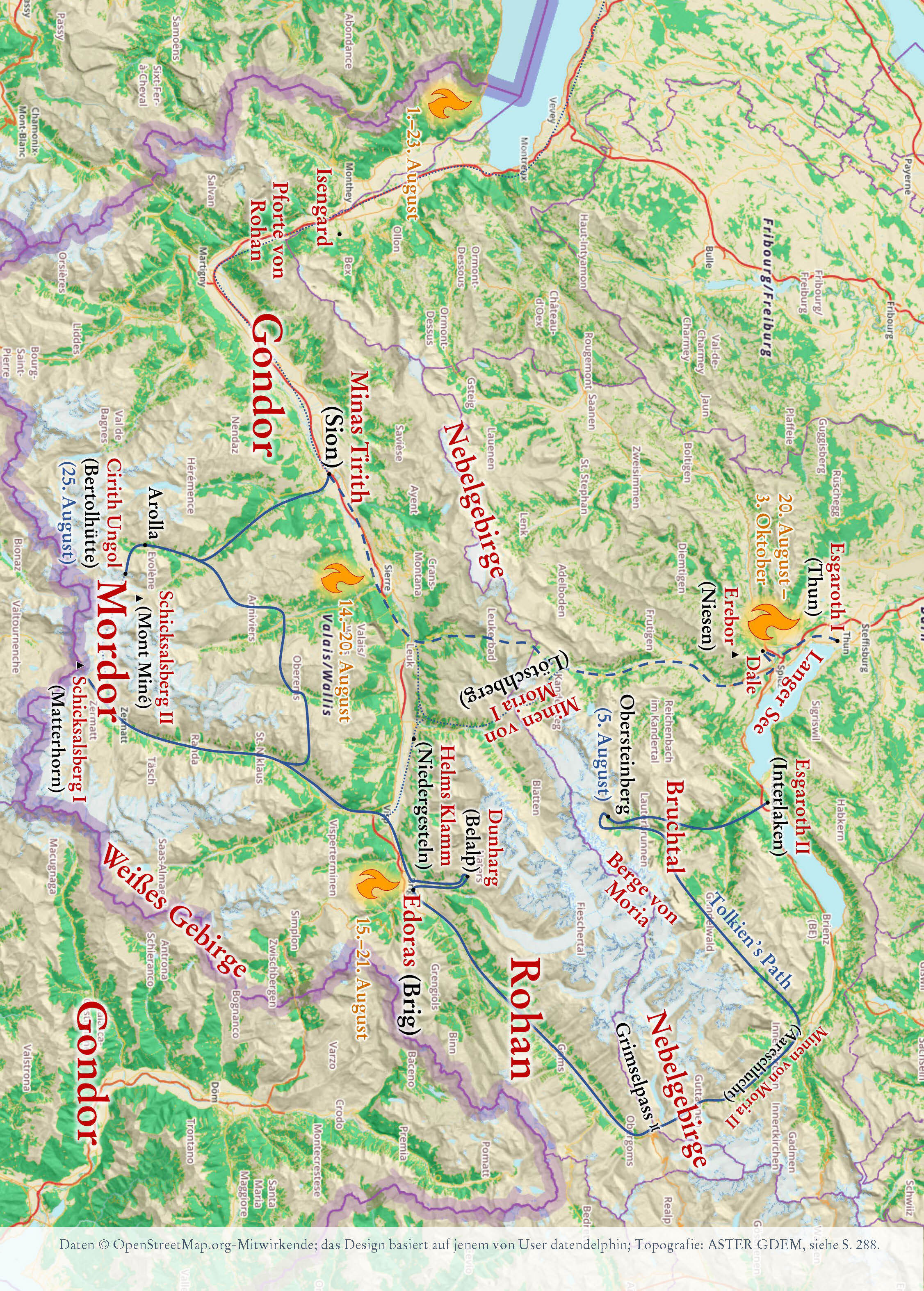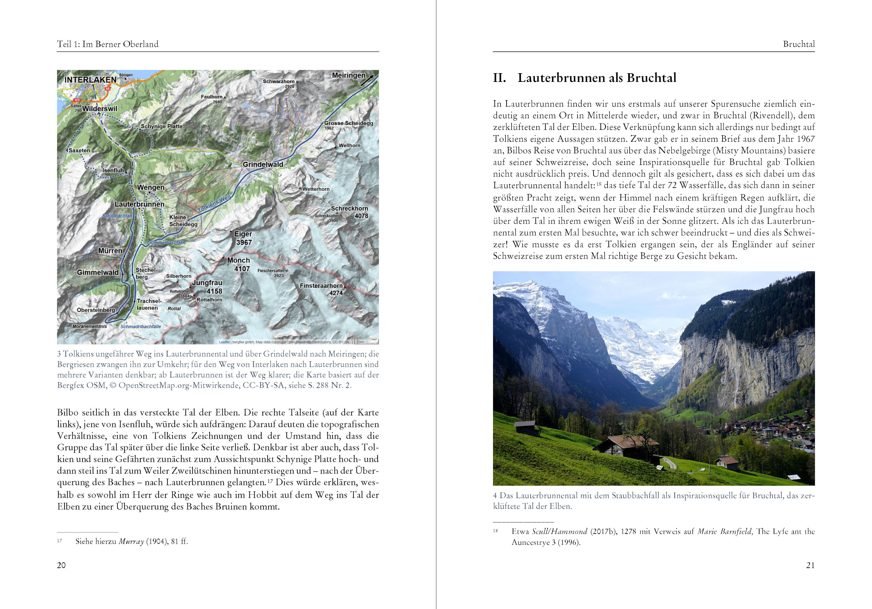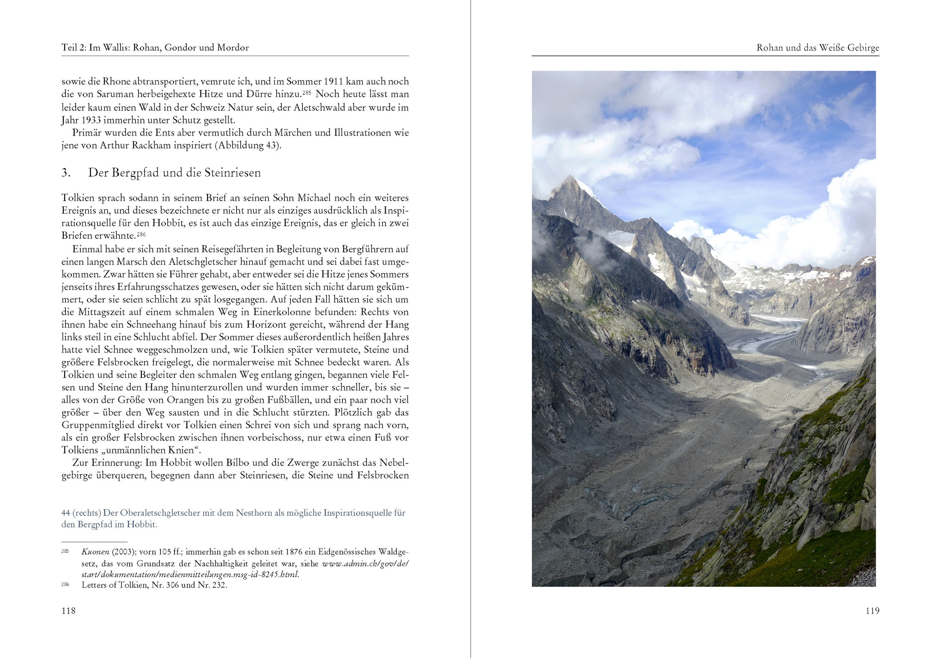 "Ich freue mich, dass Du die Schweiz kennengelernt hast, und zwar genau den Teil, den ich einst bestens kannte und der mich zutiefst geprägt hat. Die Reise des Hobbits (Bilbo) von Bruchtal auf die andere Seite des Nebelgebirges, einschließlich der Rutschpartie über die schlitternden Steine in die Nadelwälder, basiert auf meinen Abenteuern im Jahr 1911: dem Jahr des Sonnenscheins, in dem es zwischen April und Ende Oktober praktisch keinen Regen gab, außer am Vorabend und am Morgen der Krönung Georgs V. (Adfuit Omen [das war ein Omen]!)." (J. R. R. Tolkien) Mit diesen Worten begann J. R. R. Tolkien im Jahr 1967 einen Brief an seinen Sohn Michael. Detailreich erzählte er ihm darin von der Schweizreise, die er als 19-Jähriger im Sommer 1911 vor dem Beginn seines Studiums in Oxford unternommen hatte. Beim Lesen des Briefes vergisst man schnell, dass die Geschehnisse 56 Jahre zurücklagen und Tolkien 75-jährig war, als er den Brief schrieb; ja, Bilbo war in die Jahre gekommen, doch dieses Abenteuer hatte sich tief in sein Gedächtnis eingeprägt. Zwar seien seine Erinnerungen nicht mehr klar in der Reihenfolge, meinte Tolkien, die Reise aber habe viele lebhafte Bilder hinterlassen so klar wie gestern dies sei so klar, wie die entfernteren Erinnerungen eines alten Mannes würden. Abgesehen von einem allgemeinen Hinweis erwähnte Tolkien in diesem und noch einem weiteren Brief aus dem Jahr 1961 spezifische Orte und Ereignisse, die ihm als Inspirationsquellen dienten. Er selbst verknüpfte also Örtlichkeiten in Mittelerde mit konkreten Orten in der Schweiz. Auch erwähnte er, dass die Größe der Reisegruppe etwa jener im Hobbit entsprochen habe, und er bezeichnete gar ein Gruppenmitglied als einen der Hobbits. Aber die Menge an Informationen, die wir aus Tolkiens Briefen entnehmen können, ist begrenzt, und so hinterließ er uns ein Rätsel: War diese Reise lediglich eine vage Inspirationsquelle für Bilbos Überquerung des Nebelgebirges oder beschrieb Tolkien sowohl im Hobbit als auch im Herr der Ringe über große Teile hinweg jeweils autobiografisch seine eigene Reise durch die Schweiz? Der erste Schritt zur Lösung dieses Rätsels liegt in der Rekonstruktion von Tolkiens Reise, und hierfür gibt uns abgesehen von Tolkien dessen damaliger Reisegefährte Colin Brookes-Smith einige Hinweise in seinen unveröffentlichten Memoiren. Die Reise begann vermutlich noch Ende Juli und dauerte mindestens bis Ende August, wahrscheinlich aber bis in den September. Der 26. Juli 1911 war Tolkiens letzter Schultag an der King Edward's School, danach musste er ziemlich bald aufgebrochen sein vielleicht Hals über Kopf wie im Hobbit. Denn zwei Daten der Reise sind bekannt: Am Samstag, dem 5. August, unterzeichnete Tolkien das Gästebuch im Berggasthaus Obersteinberg im hintersten Lauterbrunnental, und am Freitag, dem 25. August, setzte er seinen Namen ins Gästebuch der Bertolhütte bei Arolla. Bei diesen Daten handelt es sich jedoch weder um den Anfang noch um das Ende der Reise: Angenommen, Tolkiens Gruppe reiste jeweils an den Wochenenden, dann verbrachte sie wohl zumindest die Zeit zwischen dem 29. oder 30. Juli und dem 2. oder 3. September in der Schweiz; eine spätere Rückkehr ist ebenfalls denkbar. Hinsichtlich der Route gehe ich ausgehend von Tolkiens Briefen und Colin Brookes-Smiths Memoiren von dem in Abbildung 1 dargestellten Weg aus. Der erste Teil der Reise bis zum Aletschgletscher sowie der Abstecher nach Zermatt stützen sich dabei auf Tolkiens Ausführungen, der zweite Teil der Reise bis nach Sion auf diejenigen von Colin Brookes-Smith, und auf einen allfälligen dritten Teil werde ich später zu sprechen kommen. Bemerkenswerterweise überschneiden sich die Reisebeschriebe von Tolkien und Brookes-Smith kaum. Tolkien meinte allerdings, dass seine Erinnerungen zur Reise durch das Wallis weniger klar seien, und seine Anwesenheit im Berghotel Obersteinberg sowie der Bertolhütte bei Arolla sind nun ja belegt. Ob Tolkien tatsächlich in Zermatt war, ist nicht restlos geklärt, da die von Brookes-Smith dargestellte Route nicht nach Zermatt führt und sich Tolkiens Erinnerungen dazu möglicherweise auf Arolla beziehen aber mehr dazu später. Betrachtet man diese Route, erscheint eines klar: Mindestens fünf Wochen waren dazu nötig. Allein Tolkiens Strecke von Interlaken nach Sion betrug über 250 Kilometer, und diese bewältigte die Gruppe ihm zufolge größtenteils zu Fuß und schwer bepackt. Nicht eingerechnet in dieser Kalkulation sind da all die Touren, die die Gruppe von verschiedenen Orten aus unternahm wie etwa Belalp und Arolla. Und noch viele weitere Kilometer musste die Gruppe zurücklegen, wenn sie, wie ich vermute, am Ende der Reise an den Thunersee zurückkehrte. Doch unabhängig davon war es ein Gewaltmarsch. Mit dieser Karte ausgerüstet begab ich mich selbst auf Tolkiens Spuren auf eine Reise durch das Berner Oberland und das Wallis, um nach seinen Inspirationsquellen zu suchen. Es war eine Reise durch einige der spektakulärsten Teile der Alpen, und es war auch eine Schatzsuche nach Tolkiens Schätzen der Inspiration. Ähnlich wie Bilbo scheint Tolkien in diesen Bergen etwas Kostbares gefunden zu haben, etwas, das ihn für den Rest seines Lebens in seinen Bann ziehen sollte. Und es scheint auch von mir Besitz ergriffen zu haben. Seien Sie also bitte gewarnt: Nicht jeder kann den visuellen Verlockungen der wunderbaren Landschaft widerstehen. Abgesehen von der durchwanderten Landschaft hielt ich Ausschau nach lokalen Sagen und Legenden sowie literarischen Werken anderer berühmter Reisender. Da Tolkien ein auf Mythologie spezialisierter Sprachprofessor war, vermutete ich, dass er nicht nur von der Geografie, sondern auch von den mit der Landschaft verbundenen Geschichten inspiriert worden sein könnte. Und diese Fundgrube erwies sich schnell ergiebiger als erwartet oder gar erhofft. Dadurch soll nicht der Eindruck entstehen, dass Mittelerde gänzlich auf der Schweiz beruht: T
