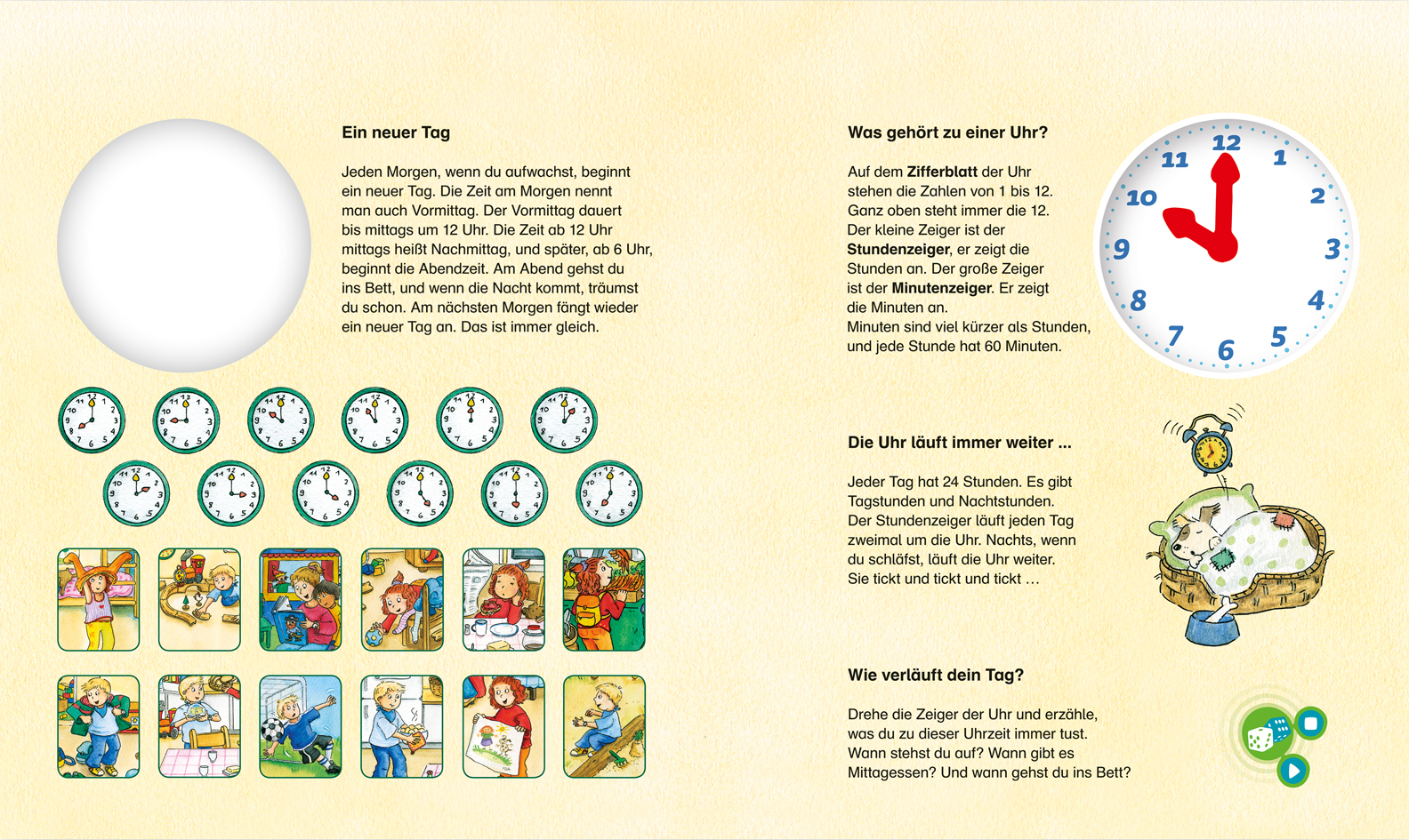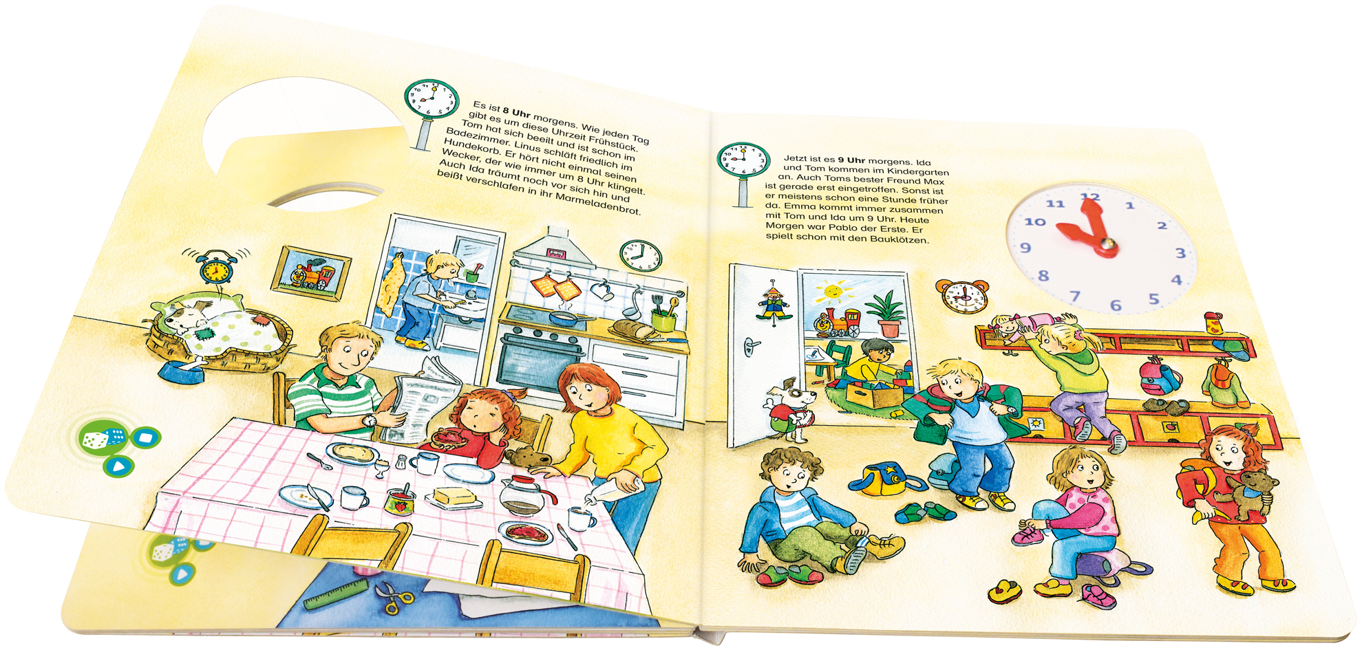Interaktiv die Uhr lernen? Das funktioniert anhand der BOOKii® Technologie mit diesem Uhrenbuch prima! Spielerisch lernen die Kinder, ein Verständnis für Tageszeiten und -abläufe zu entwickeln. Wann beginnt der Kindergarten? Um wie viel Uhr isst die Familie zu...