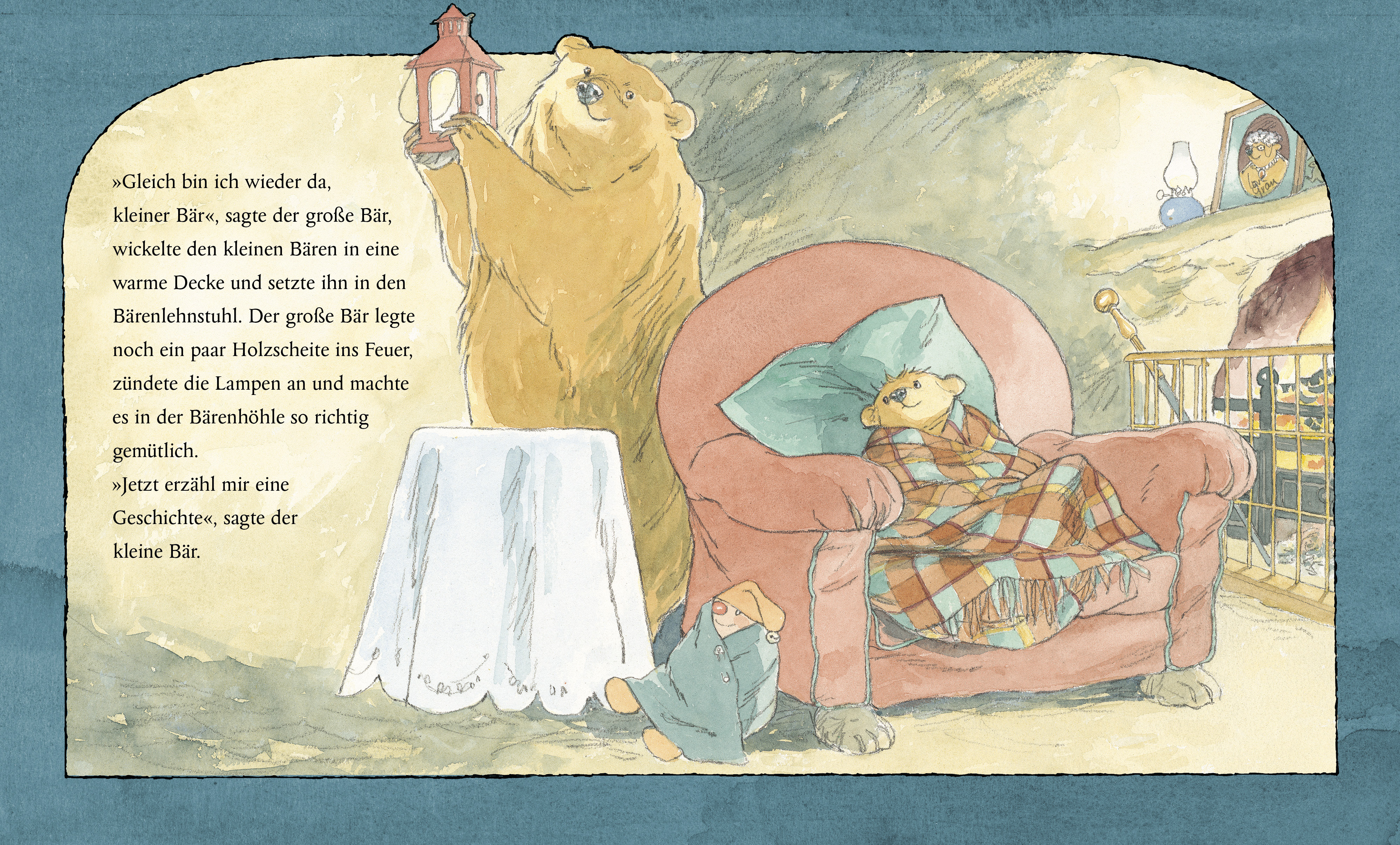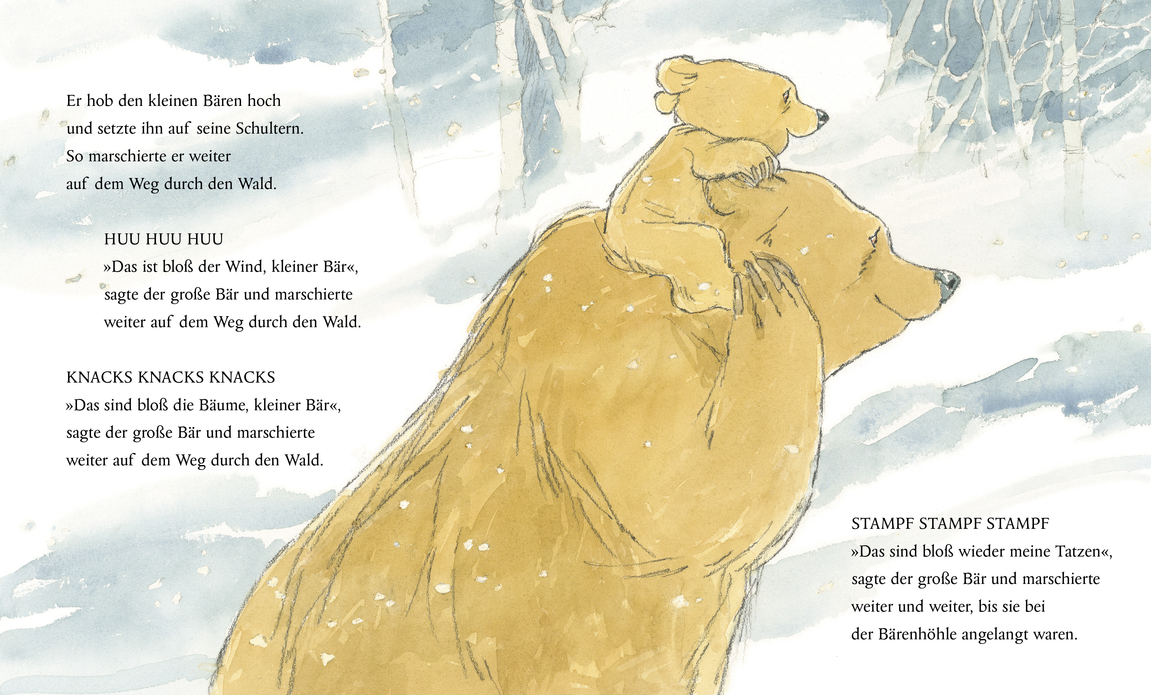 Eine zauberhafte Geschichte über Winterspaziergänge und wie schön es sein kann, wieder nach Hause zu kommen Der kleine Bär und der große Bär marschieren durch den Wald. Doch was sind das für unheimliche Geräusche um sie herum? Es braust und knackst. Und der W...
