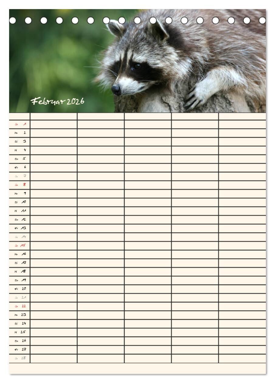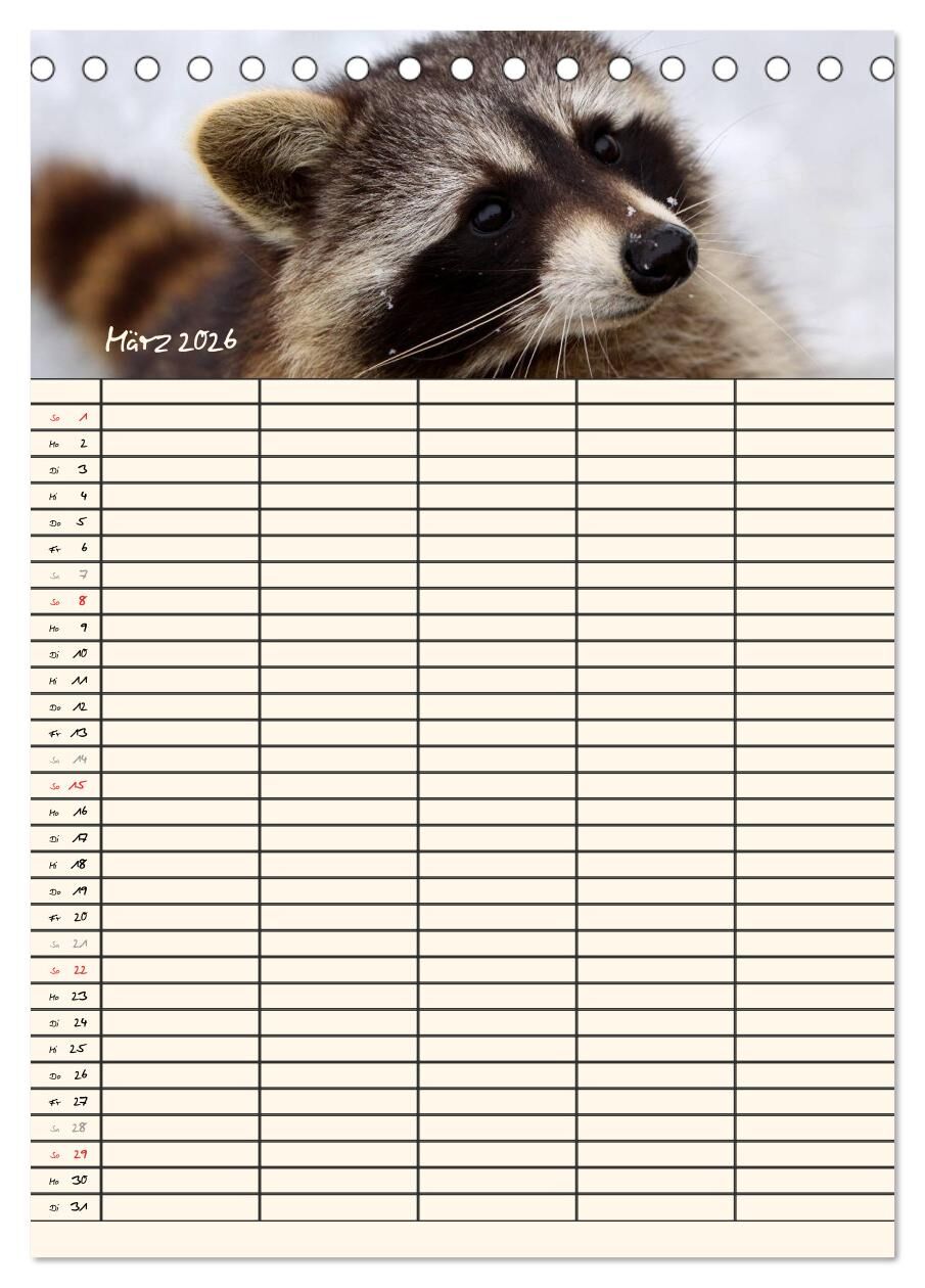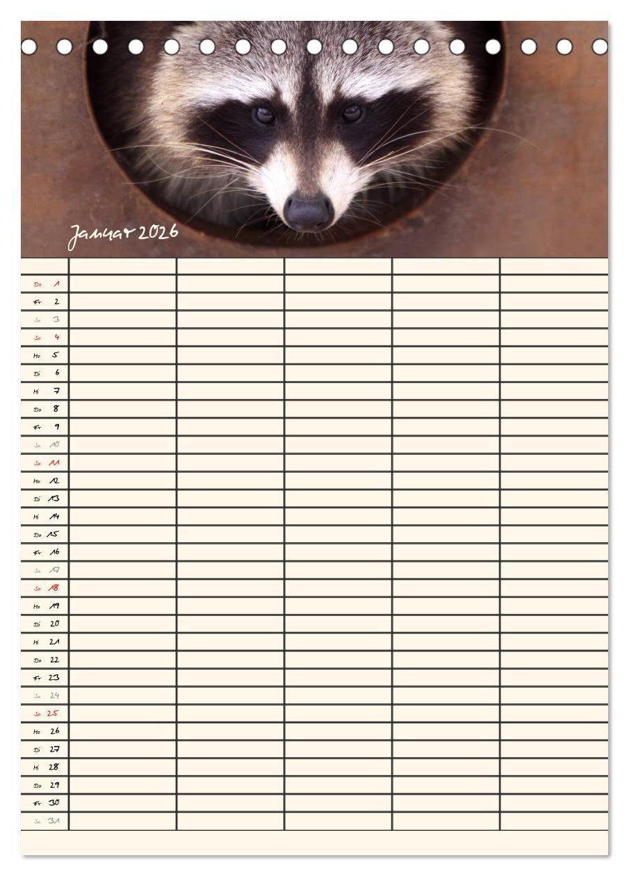 Lassen Sie sich von den kleinen putzigen Waschbären durch das Jahr begleiten und erfreuen Sie sich jeden Monat an einem neuen maskierten Räuber. Die Waschbären helfen Ihnen bei der Planung der Termine Ihrer Familienmitglieder.