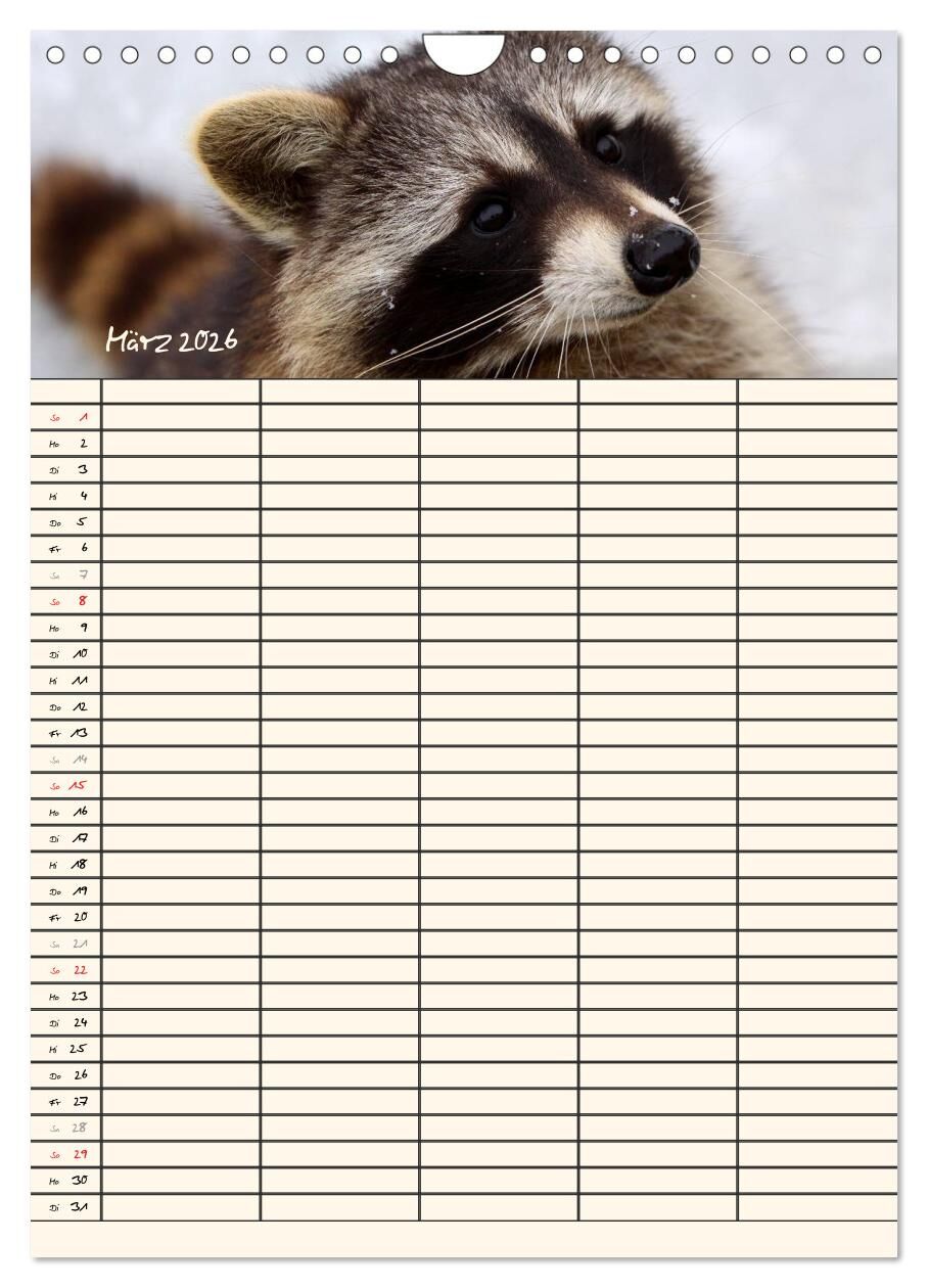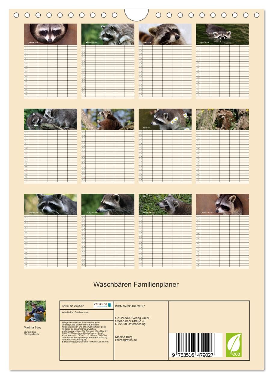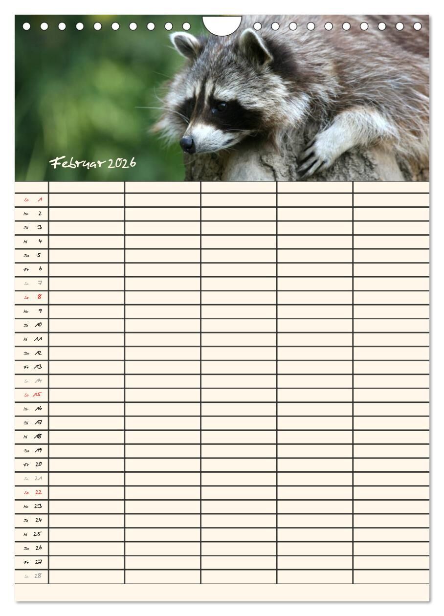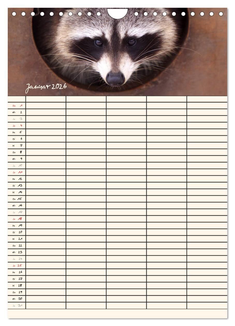 Lassen Sie sich von den kleinen putzigen Waschbären durch das Jahr begleiten und erfreuen Sie sich jeden Monat an einem neuen maskierten Räuber. Die Waschbären helfen Ihnen bei der Planung der Termine Ihrer Familienmitglieder.