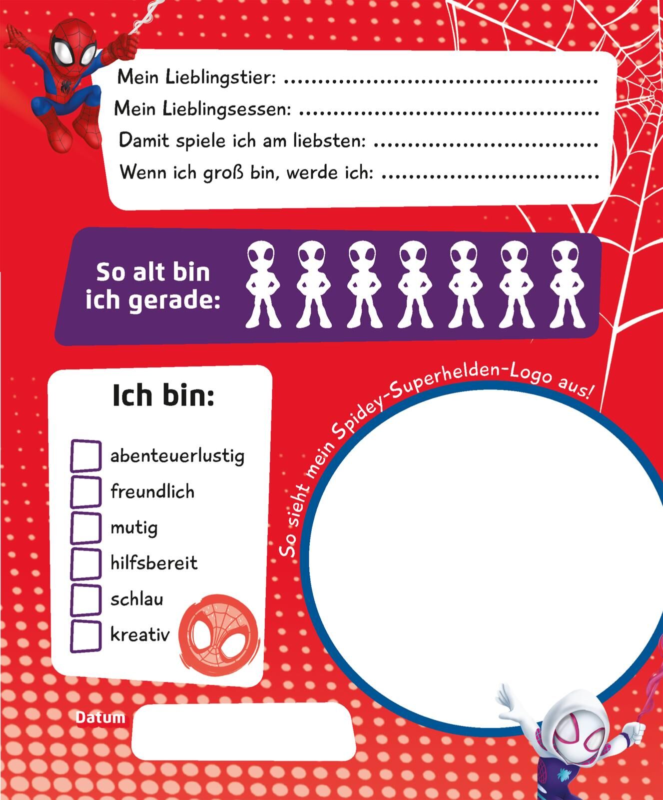 Ein Kindergarten-Freundebuch für kleine Spidey-Fans! In diesem Kindergarten-Freundebuch können sich kleine Freunde und Freundinnen aus dem Kindergarten verewigen. Spidey und seine Super-Freunde begleiten sie dabei durch niedlich gestaltete Seiten. Mit übersic...