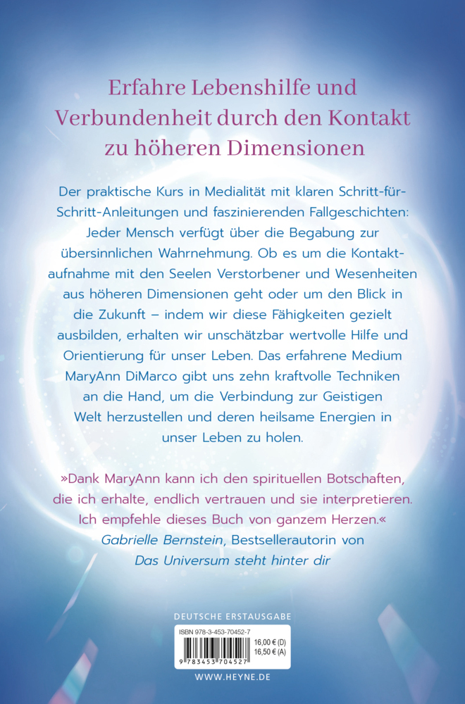 Jeder Mensch verfügt über die Begabung zur übersinnlichen Wahrnehmung. Ob es um die Kontaktaufnahme mit den Seelen Verstorbener und Wesenheiten aus höheren Dimensionen geht oder um den Blick in die Zukunft indem wir diese Fähigkeiten gezielt ausbilden, erhalte...