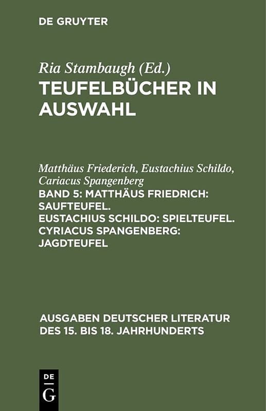 Keine ausführliche Beschreibung für "Matthäus Friedrich: Saufteufel. Eustachius Schildo: Spielteufel. Cyriacus Spangenberg: Jagdteufel" verfügbar. Klappentext Die Reihe Ausgaben Deutscher Literatur des XV. bis XVIII. Jahrhunderts" startete 1967 mit d...