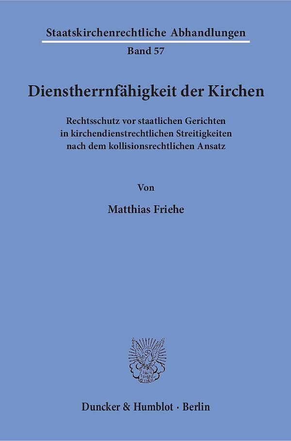 »The >Dienstherrnfähigkeit< (Ability to Act as a Public Service Employer) of the Churches« This study develops a new approach to the controversial question of whether clergymen and »church officials« are able to obtain legal protection in the state courts regarding their employment relationship. The »Dienstherrnfähigkeit« (ability to act as a public service employer) that is guaranteed by the Basic Law (Grundgesetz), i.e. the German Constitution, is regarded as a conflict-of-laws provision here, so that the respective ecclesiastical legal order comes to apply, and can therefore substitute the binding state law up to the boundary of ordre public. The state courts must provide legal protection that is very much limited.