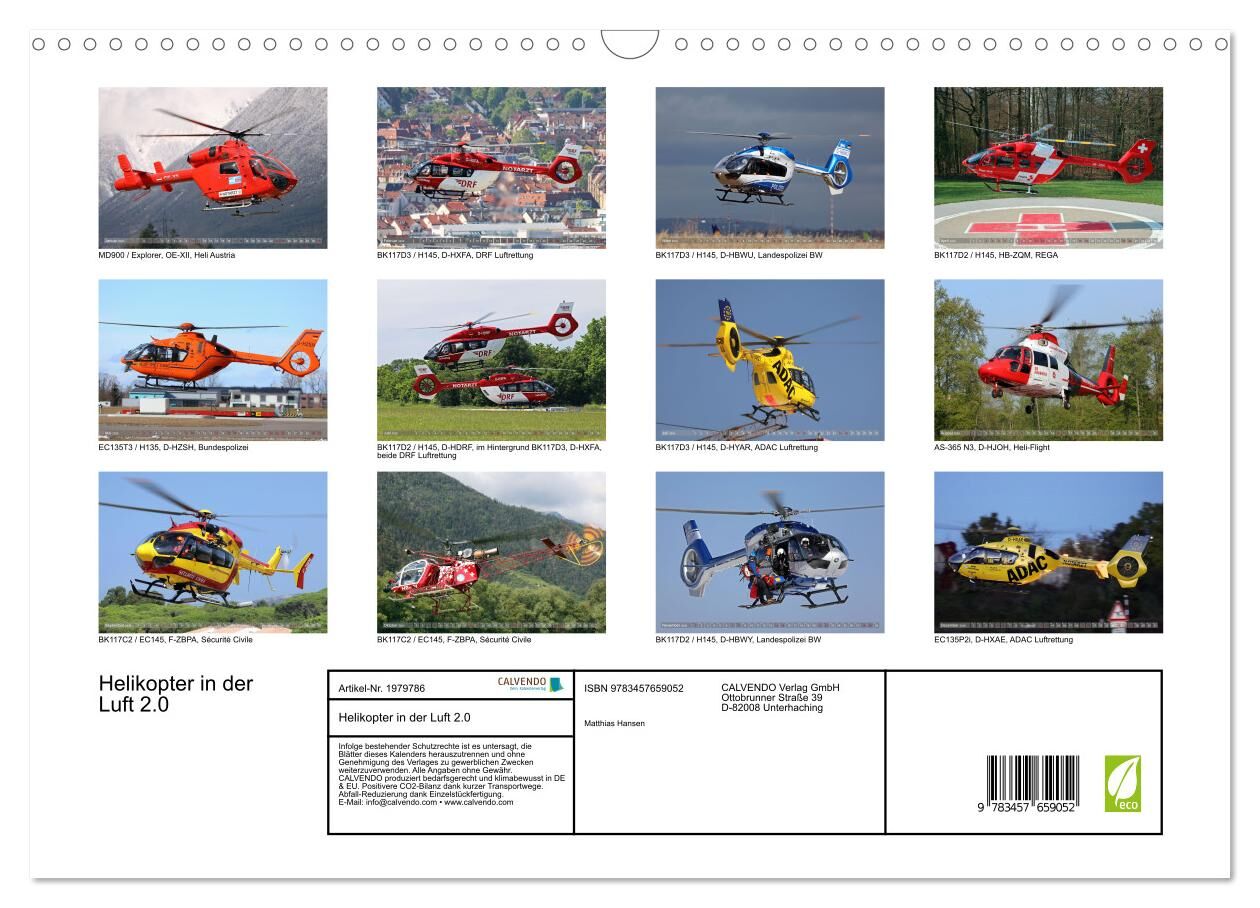 Der Kalender enthält jeweils pro Monat ein eindrucksvolles Bild eines Hubschraubers in der Luft. Es sind verschiedene Helikoptermuster in unterschiedlicher Umgebung abgebildet. Ein Genuss für alle Helikopterfans und Liebhaber guter Technik-Bilder.