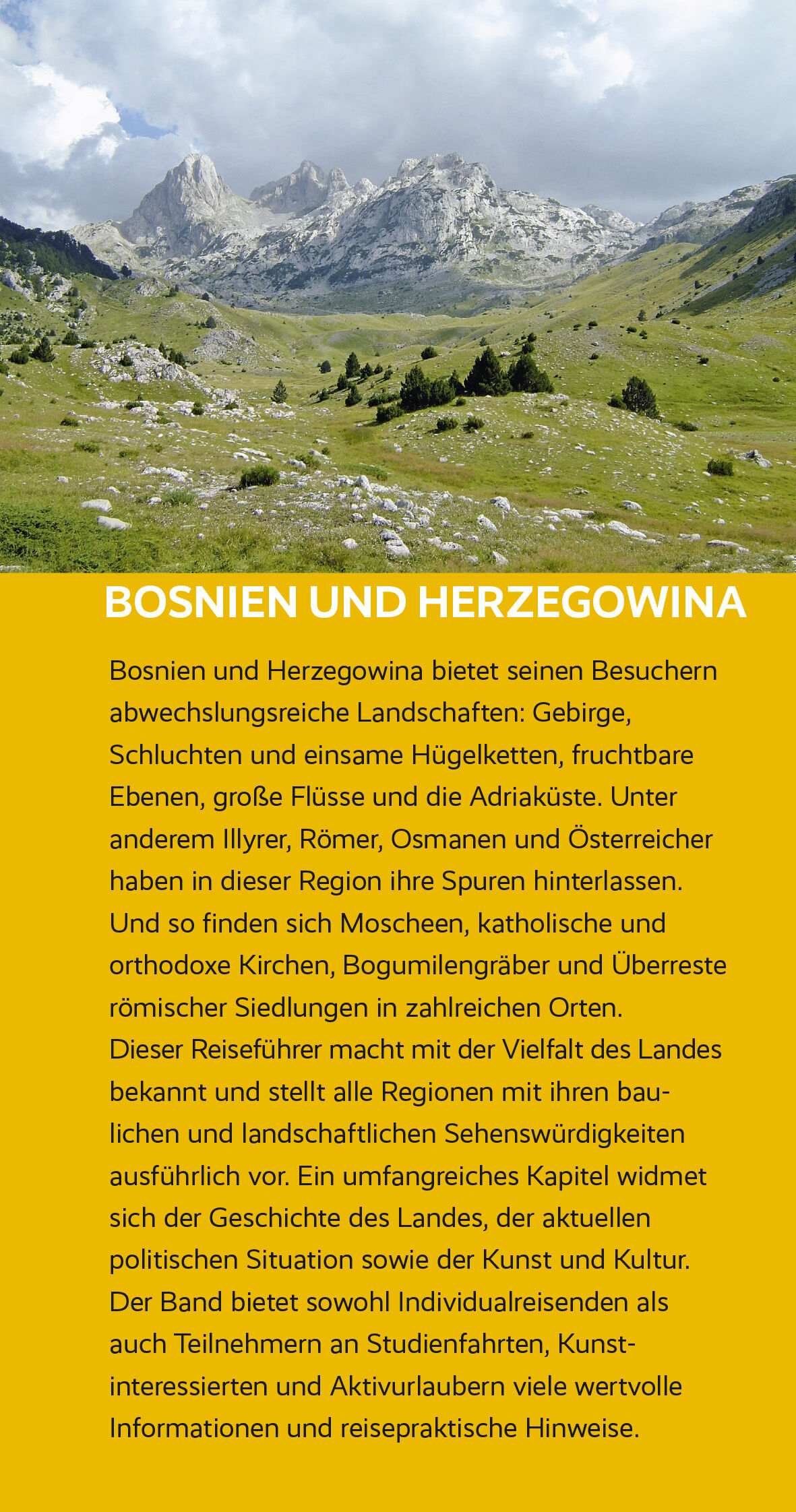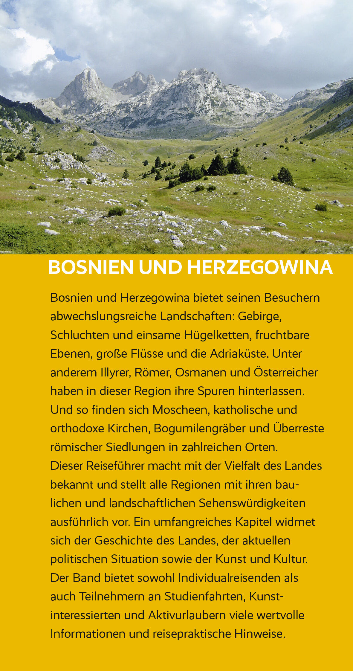 Ob im zerklüfteten Dinarischen Gebirge mit tiefen Schluchten und einsamen Höhen, ob in den südlichen Ebenen oder an der schmalen Adriaküste: Dichte Wälder und schroffe Bergwelten, wilde Flussläufe und die Nationalparks Sutjeska, Kozara, Drina und Una laden zum Wandern, Klettern, Biken, Raften, Paddeln und Baden ein. Viele Völker haben im Lauf der Zeit ihre Spuren hinterlassen. Reste römischer Siedlungen, Bogumilengräber, Moscheen und Synagogen, katholische und orthodoxe Kirchen bezeugen die große Geschichte und kulturelle Vielfalt im Land.